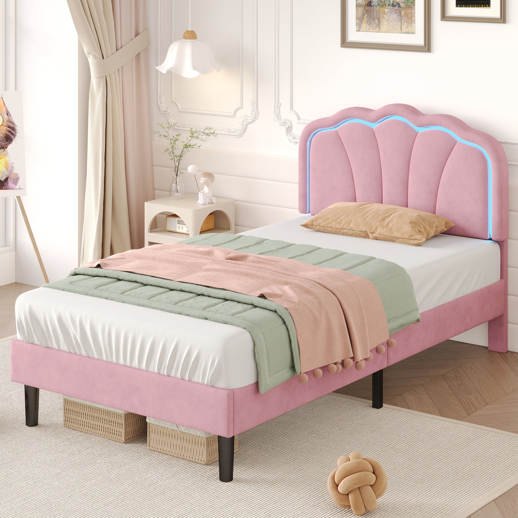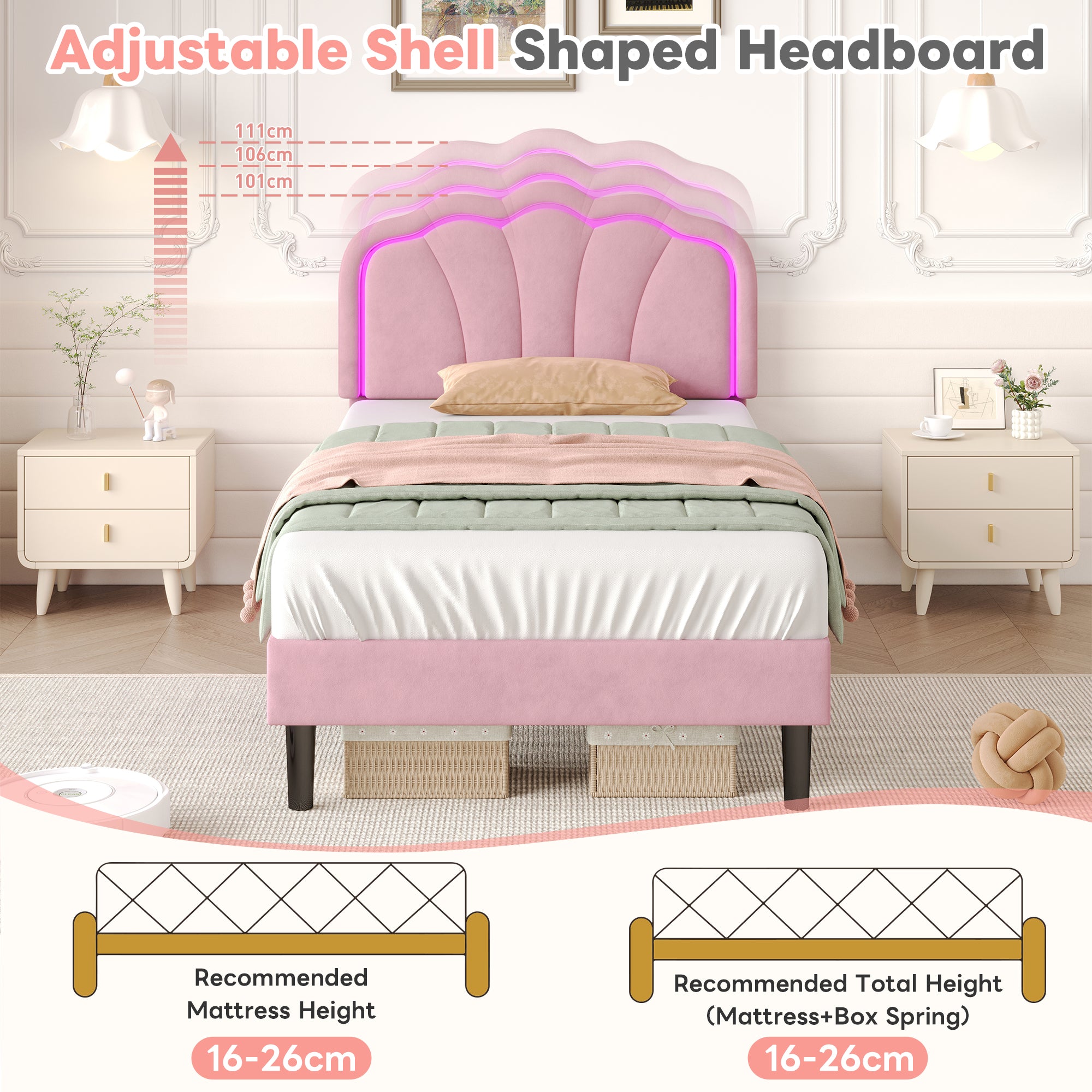3ft Single Upholstered Bed with LED Adjustable Shell Shape Headboard, Soft Velvet, Pink