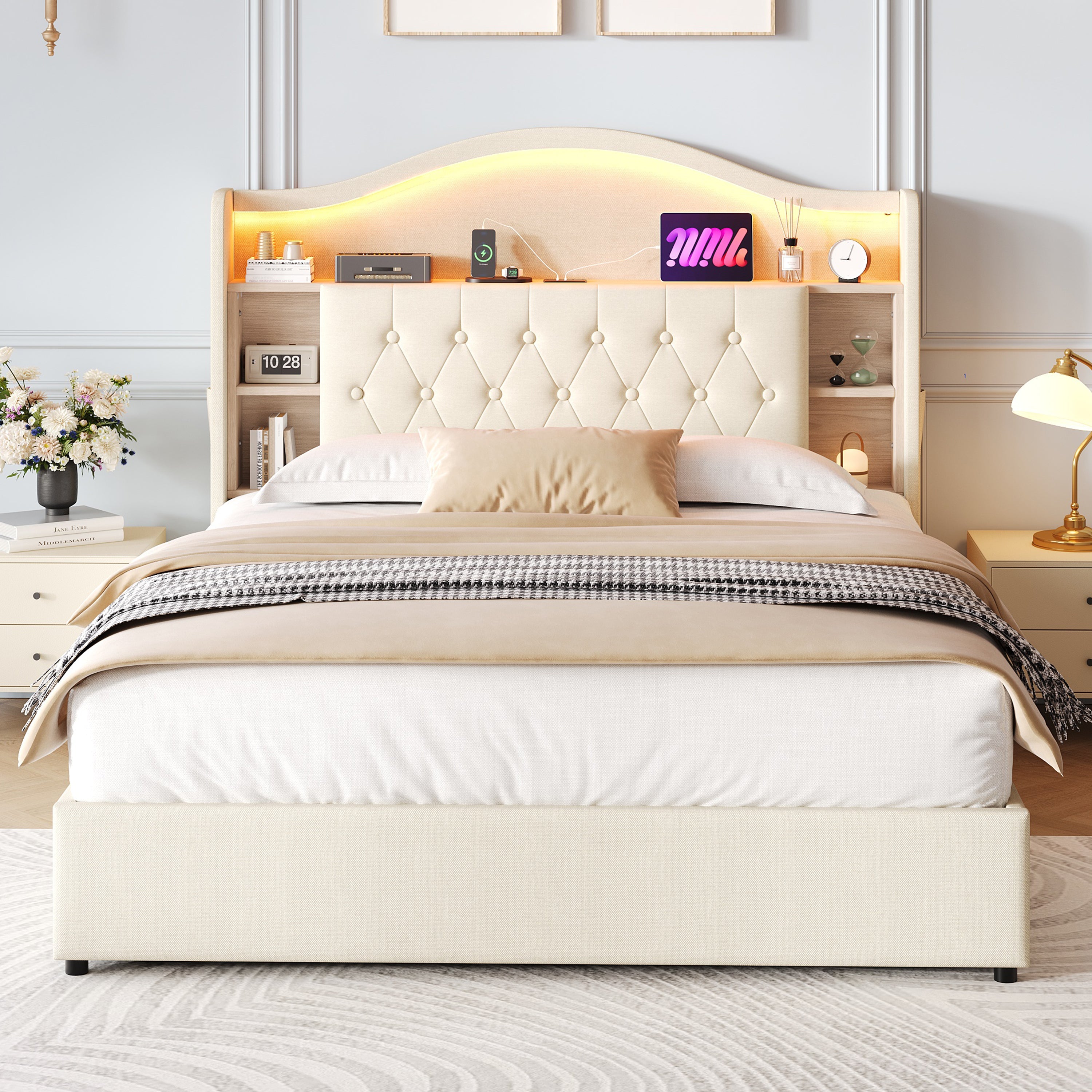 4ft6 Double Upholstered Bed Frame with Hydraulic Storage, LED Headboard & Charging Ports, Linen Beige