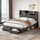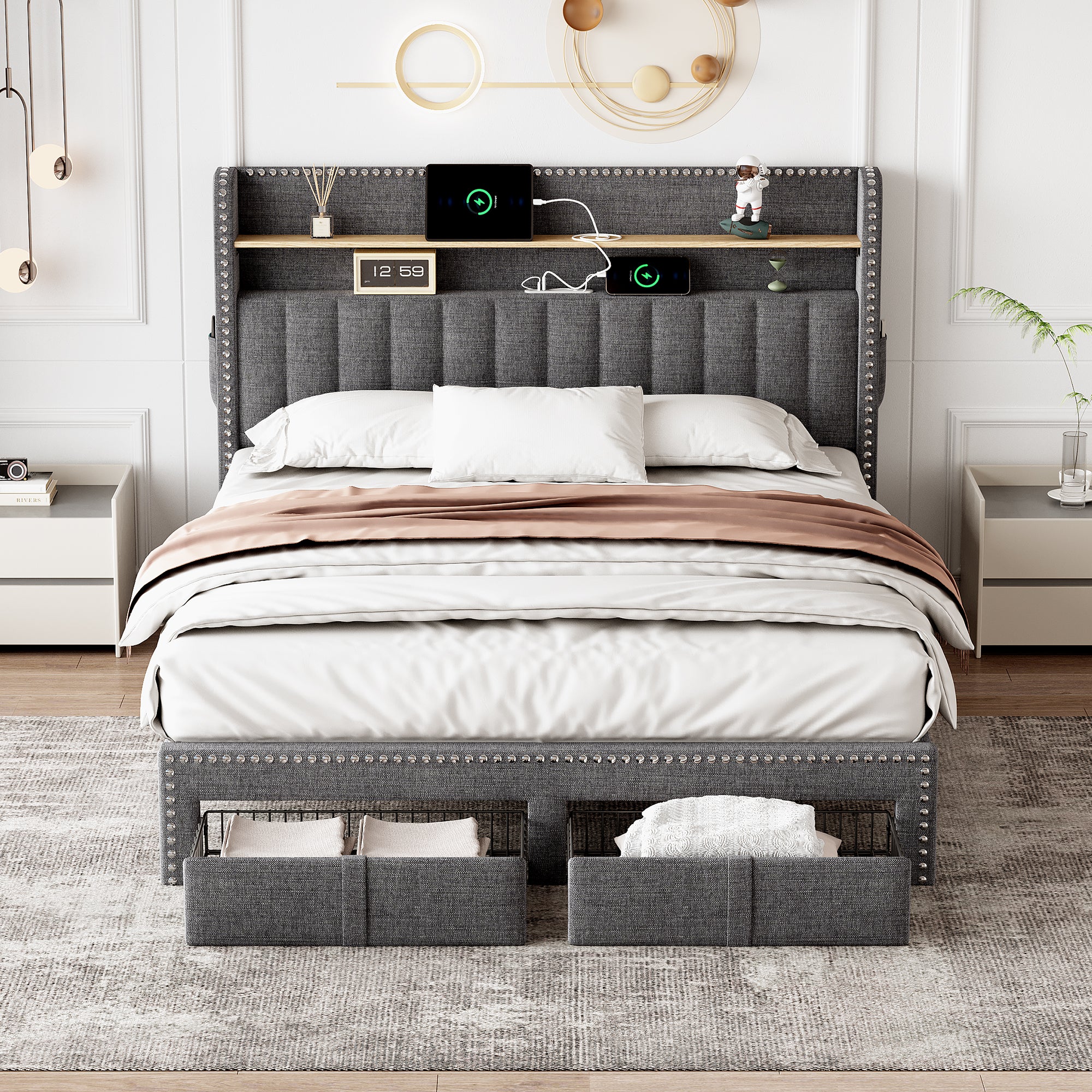 4ft6 Double Upholstered Bed with 2 Storage Drawers, Riveted, Charging & Lighting, Linen Platform, Grey