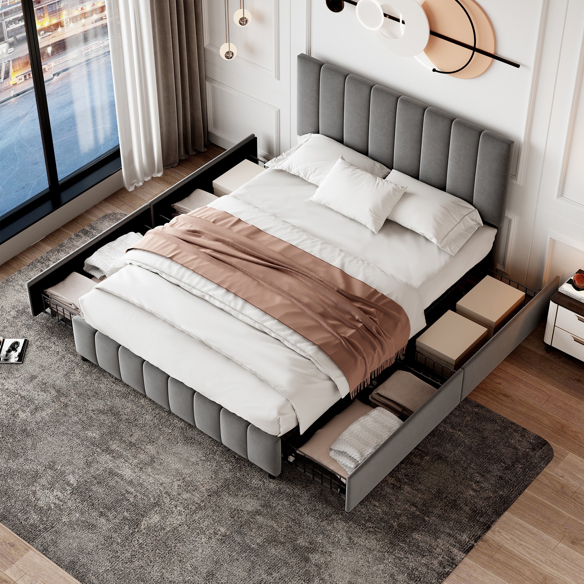 4ft6 Double Upholstered Bed with 4 Storage Drawers, Adjustable Channel Tufted Headboard, Grey Velvet