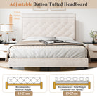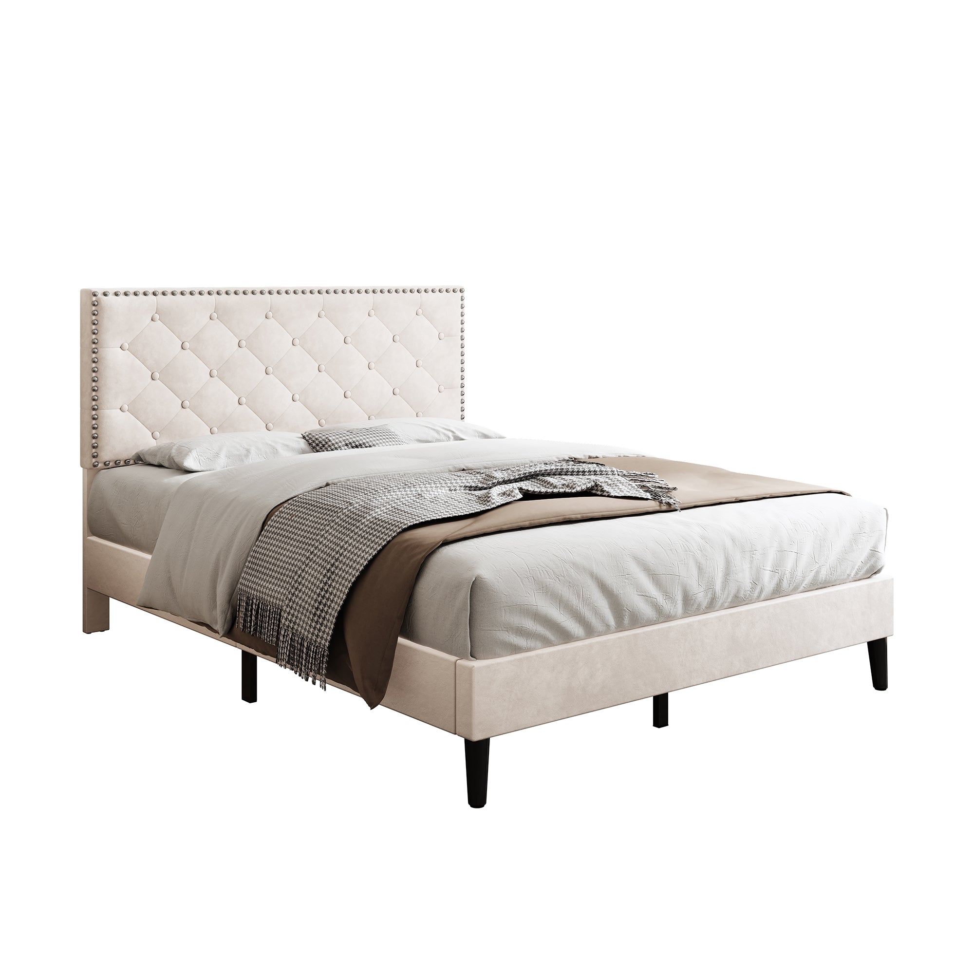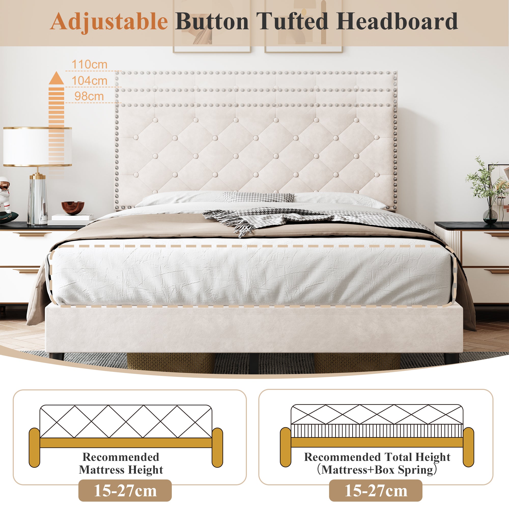 4ft6 Double Upholstered Velvet Bed Frame, Adjustable Button-Tufted & Riveted Headboard, Beige Velvet