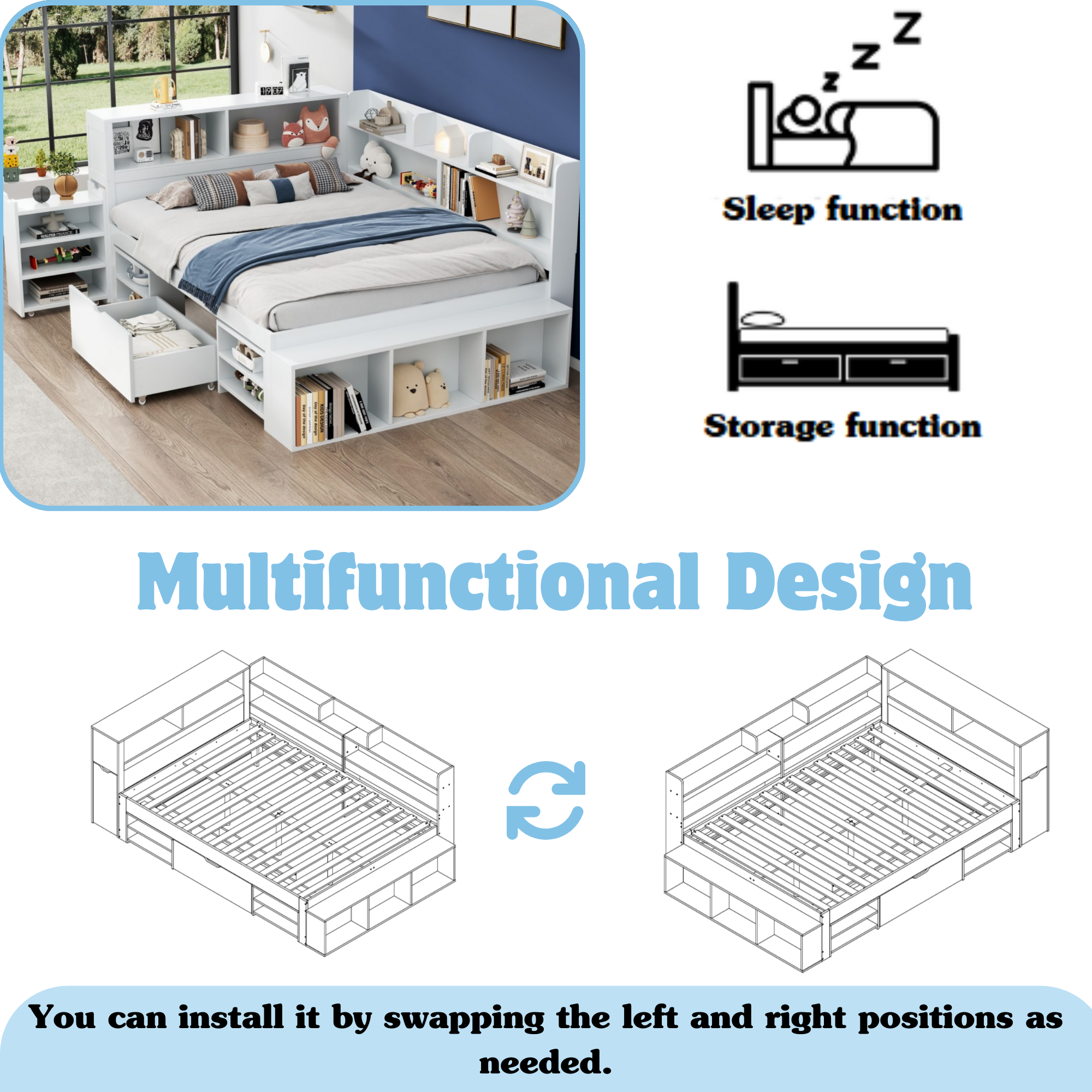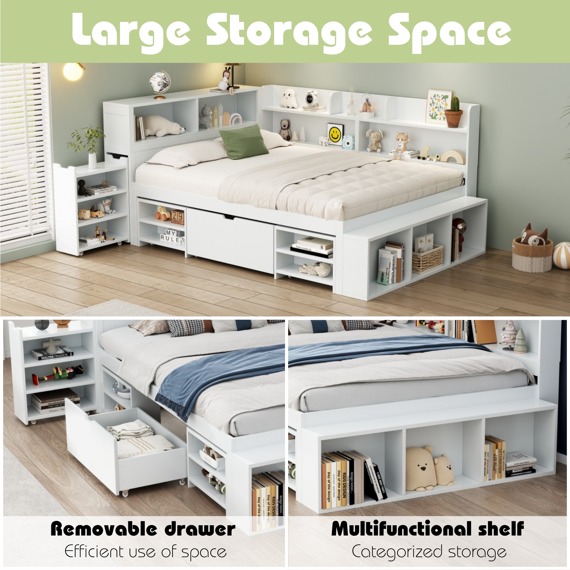 This multifunctional kids’ bed is the perfect space-saving solution, combining a comfortable sleeping area with drawers, bookshelves, and storage cabinets. Designed to maximise every inch of space, it helps create a neat and organised environment where your child can rest, play, and learn. With dedicated storage options for clothes, toys, and books, everything stays within easy reach and neatly tucked away.