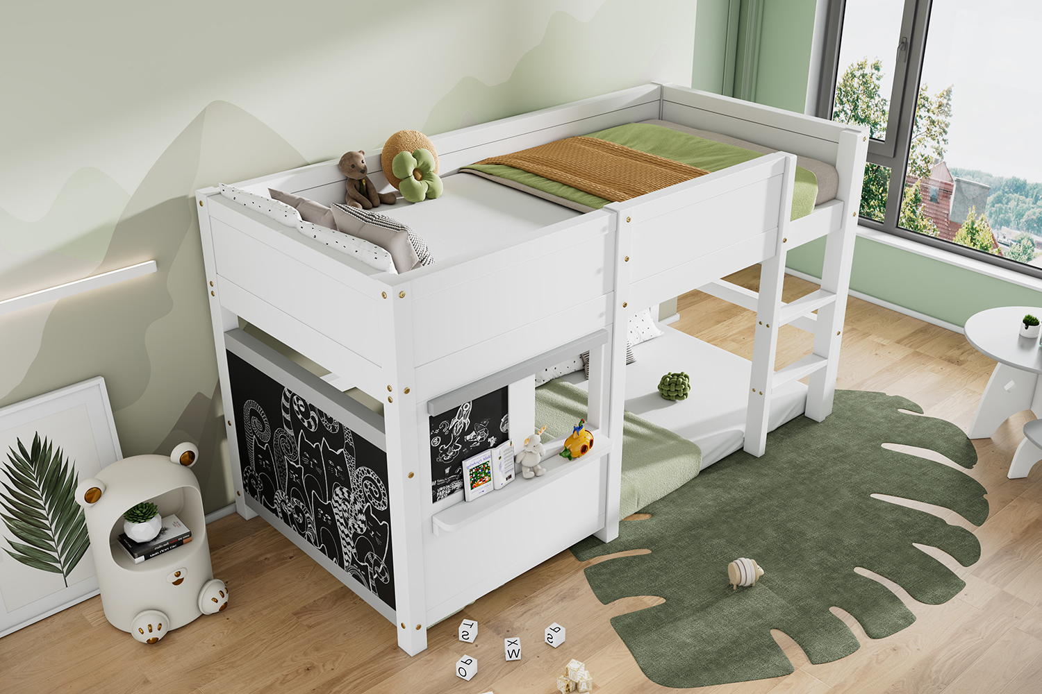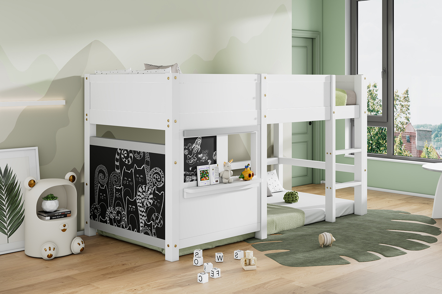 More than just a bed, it doubles as a play space with a built-in blackboard on the side and front for drawing and doodling, plus a handy shelf to store chalk or small decorations. A three-step staircase with 6 cm wide steps makes climbing easy and safe, while protective fencing around the bed ensures peace of mind during sleep. With its thoughtful design, this bed strikes a perfect balance between style, fun, and safety for growing children.