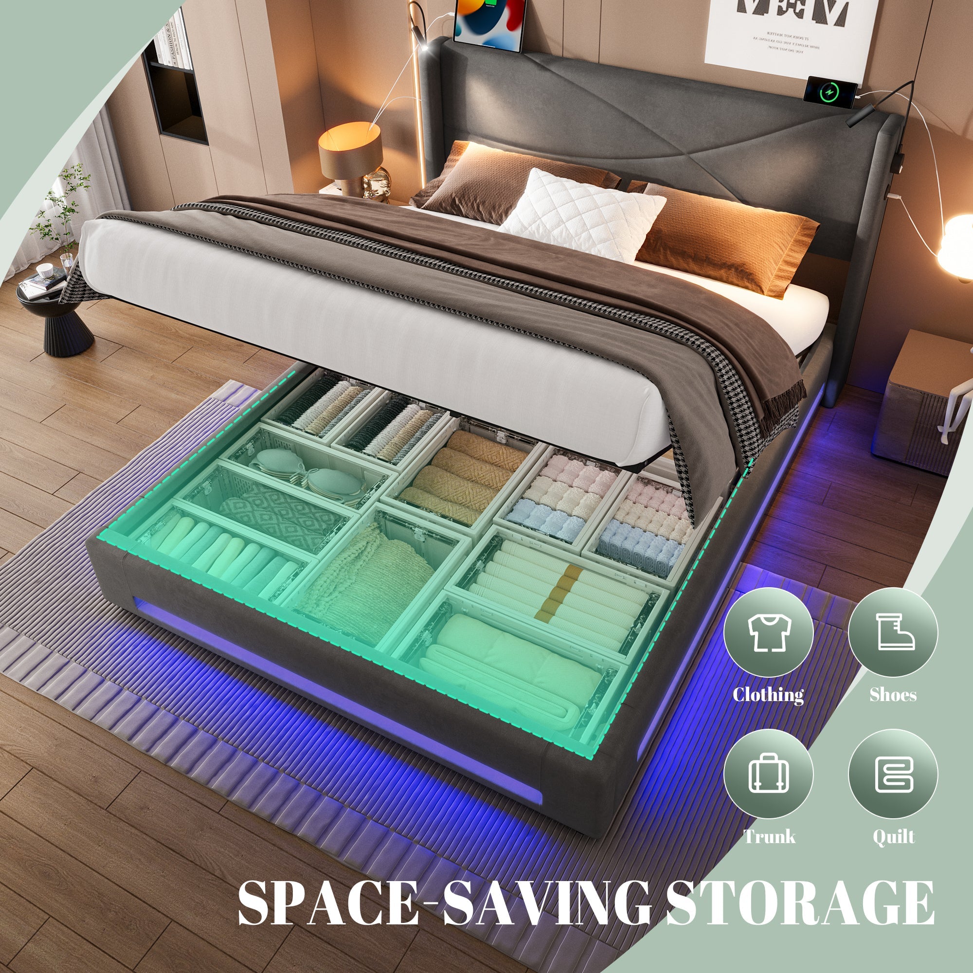 Modern Bed Frame with Reading Lamps, LED, Hydraulic Storage, USB Ports, Dark Gray