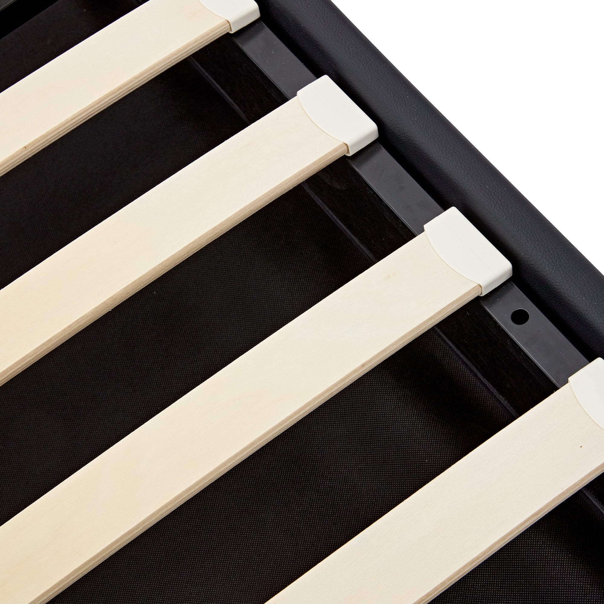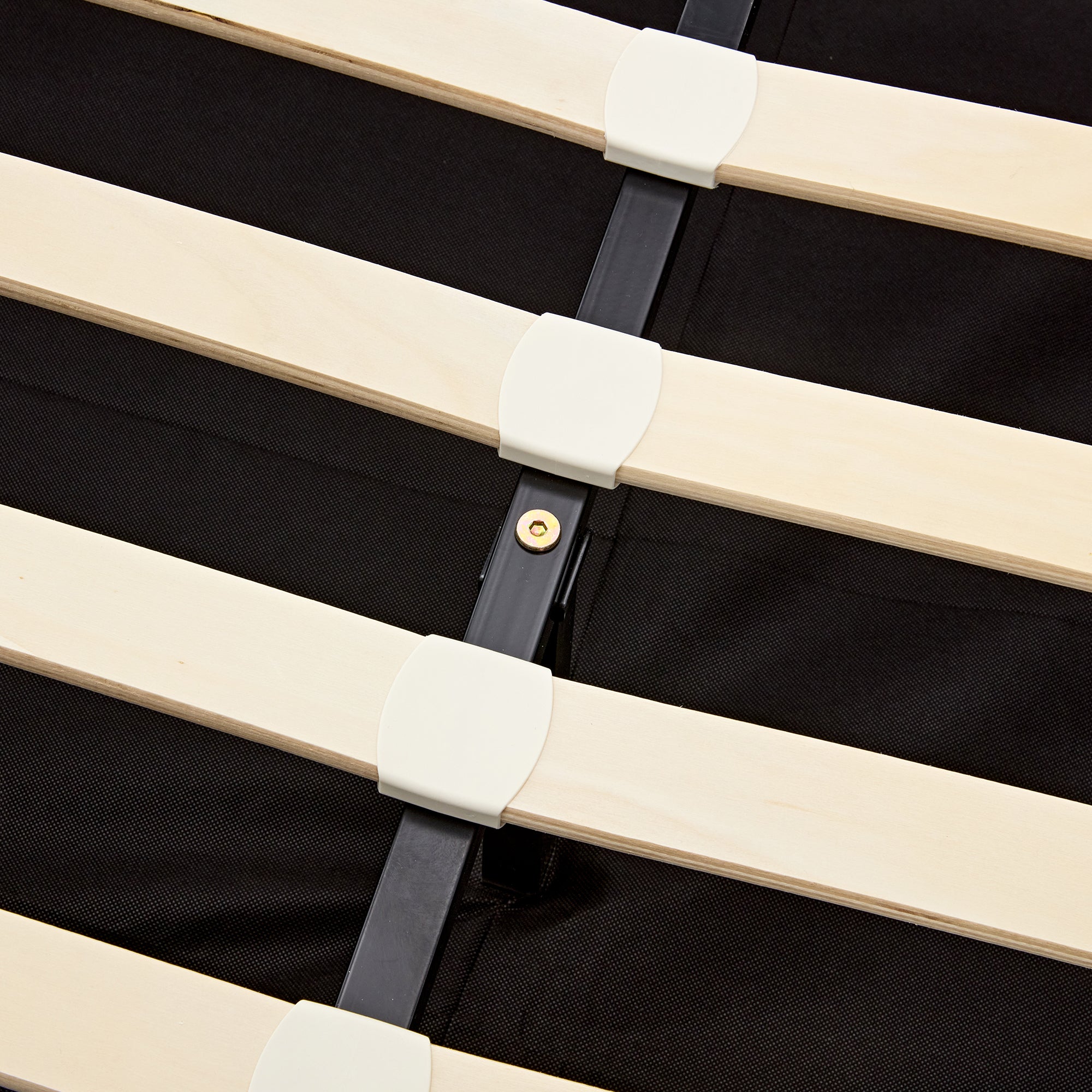 The upholstered bed features a stable 5 cm wide slat frame, providing excellent support and stability for a comfortable sleep.