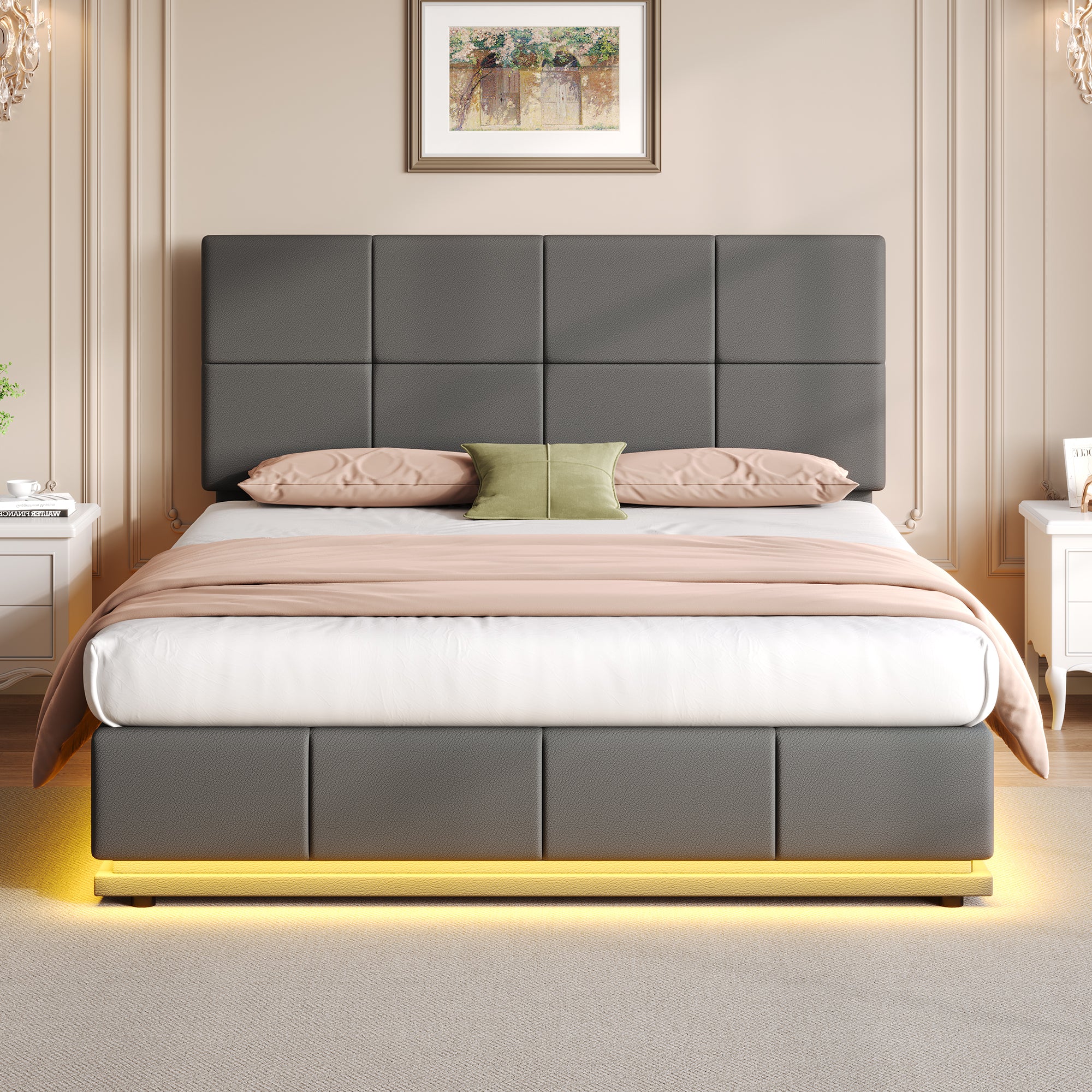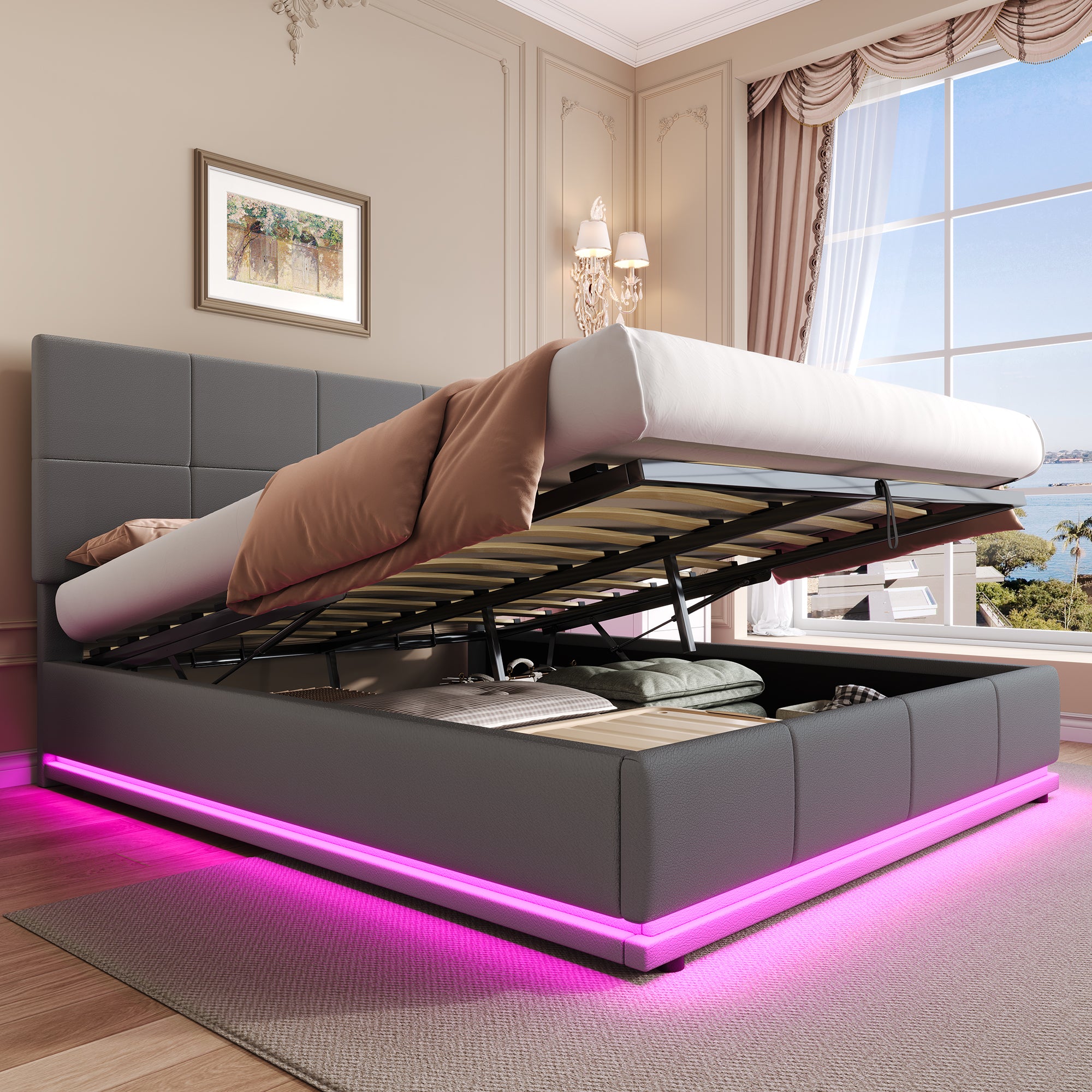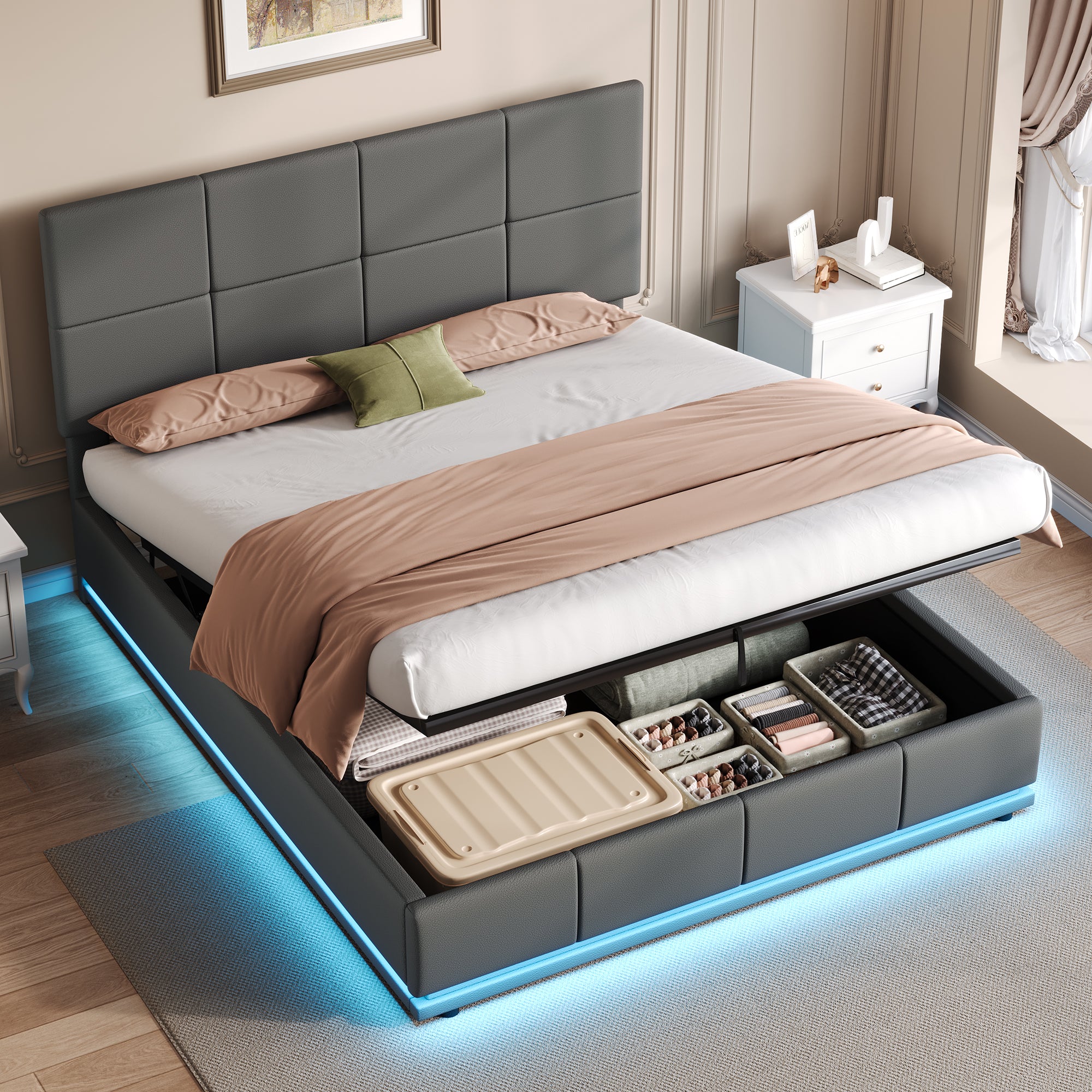 Ottoman Double Bed with LED Lighting, Hydraulic Storage, Adjustable Square Tufted Headboard, Grey PU Leather (No Mattress)