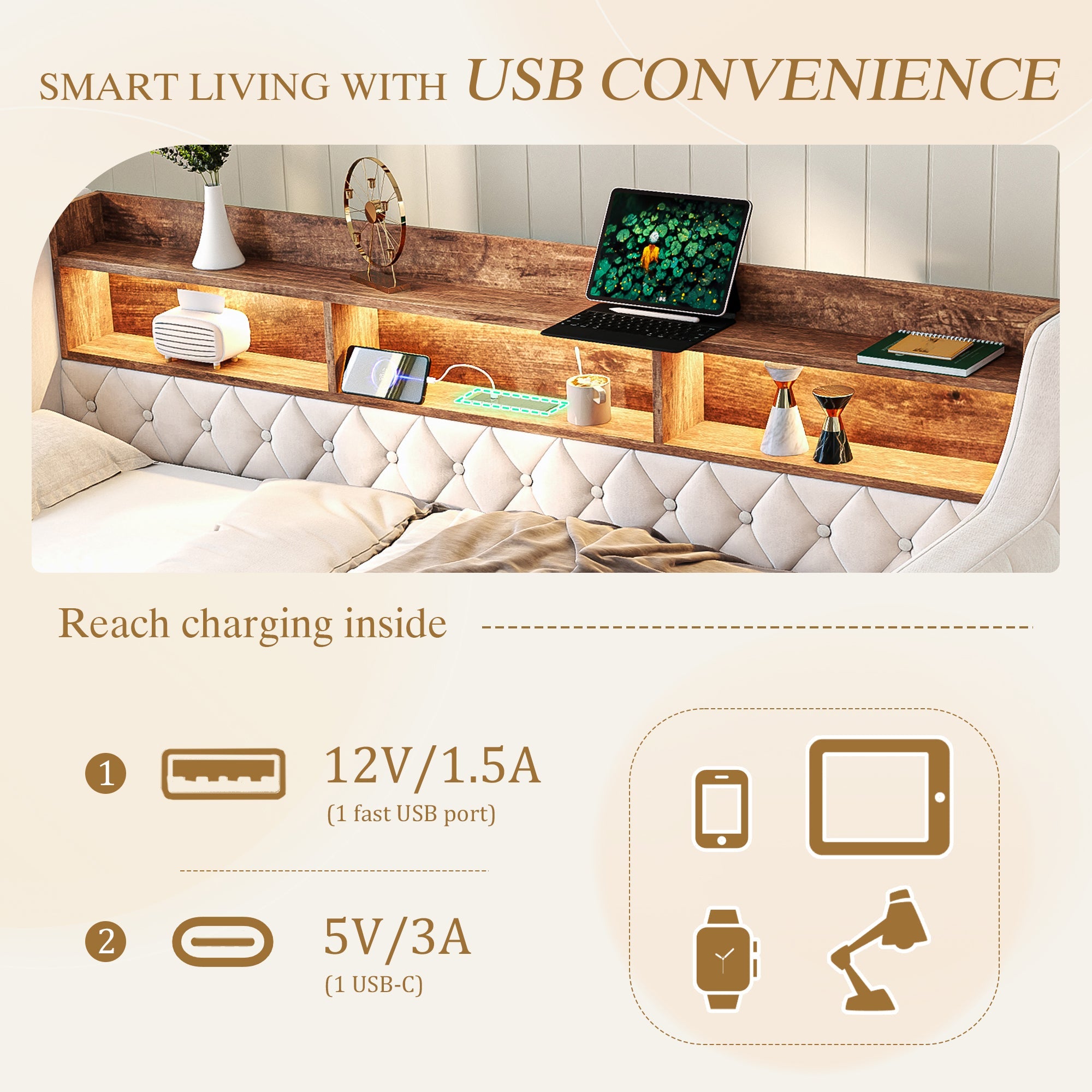 Reading, working, or simply relaxing—the integrated shelf keeps your phone, book, or remote control always within reach. No more clutter, everything has its place. Thanks to the convenient USB Type-C port, you can charge your devices directly by the bed. This allows you to enjoy complete convenience without having to get up, ideal for modern, smart living concepts.