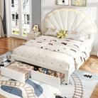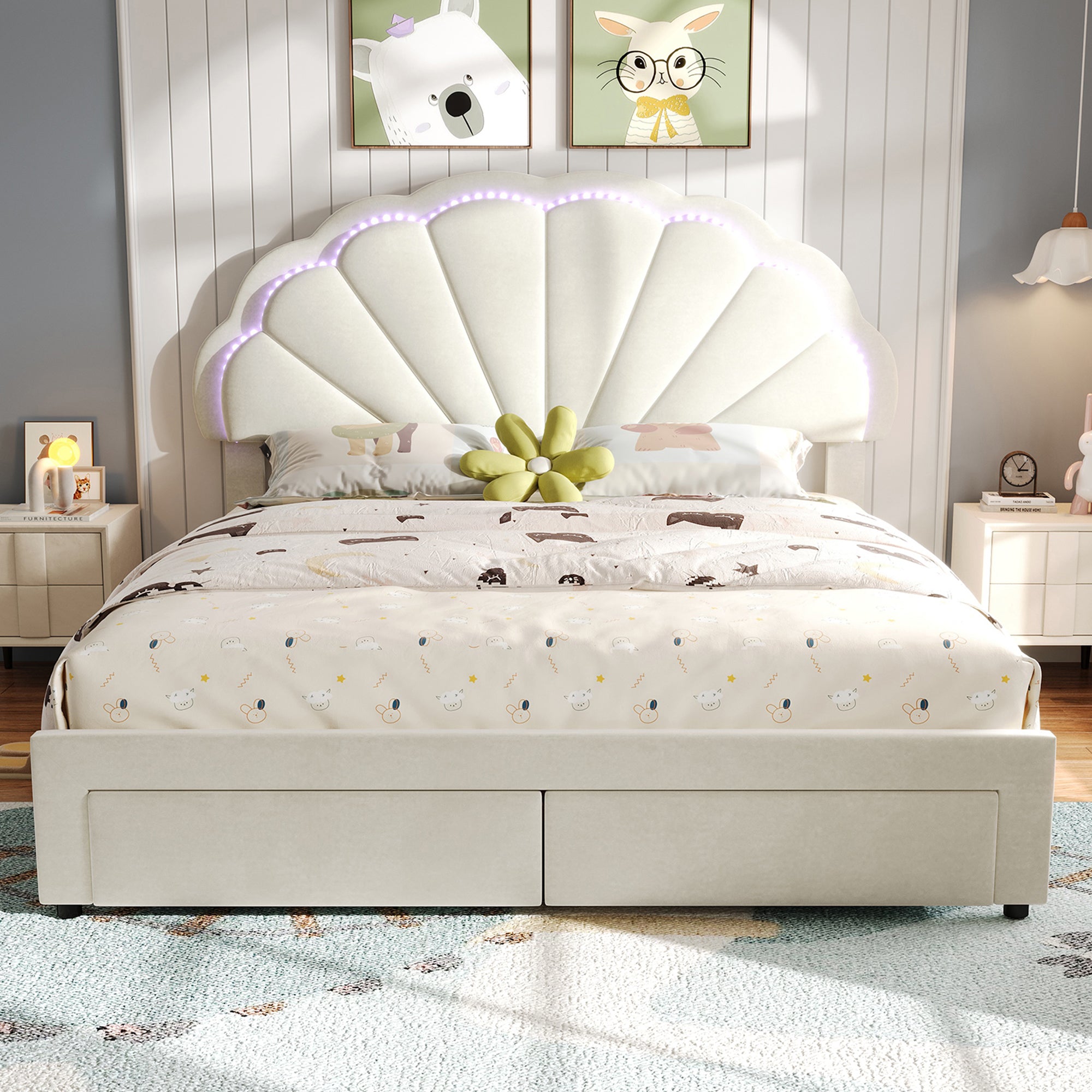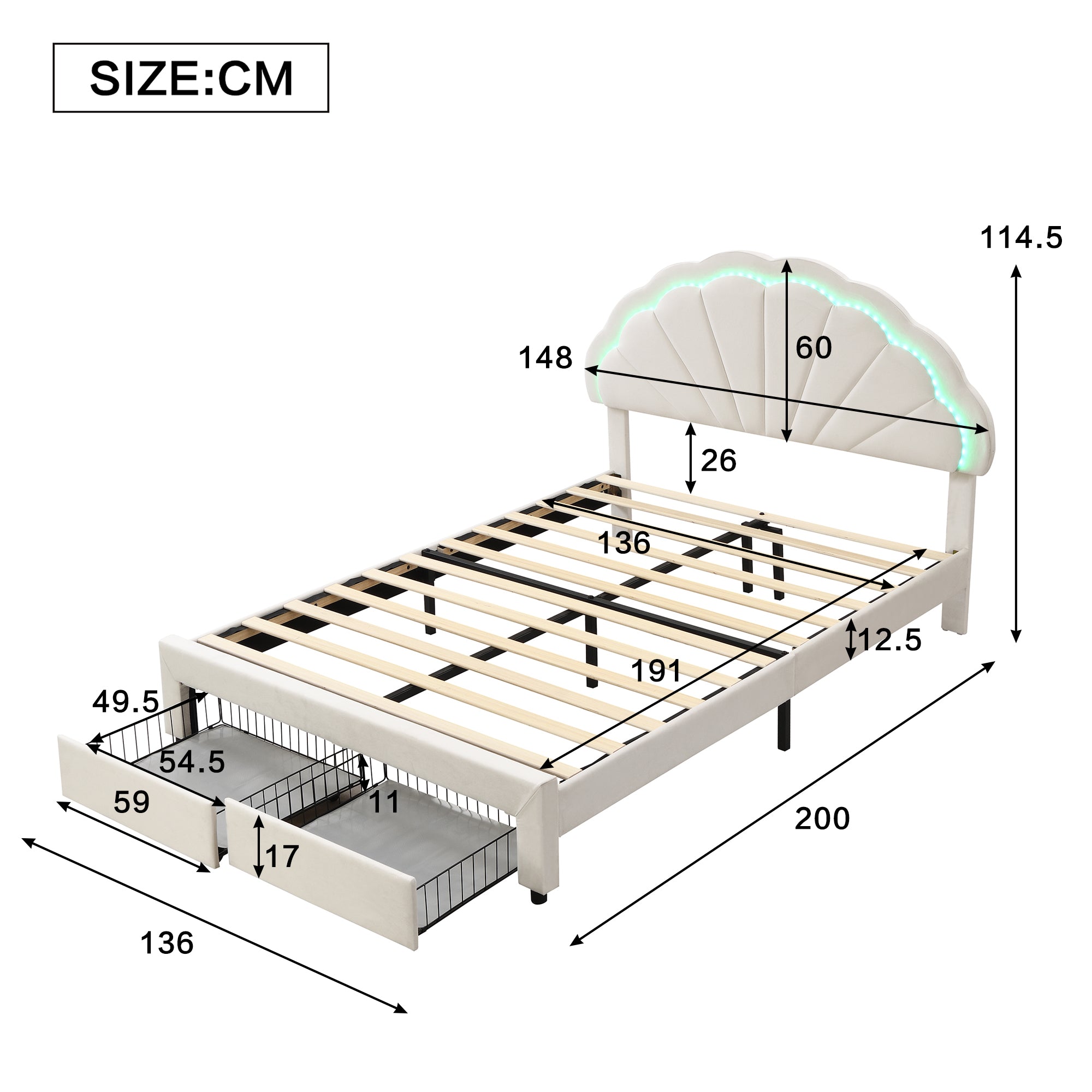 Upholstered Bed, 4ft6 Double 135x190cm, Shell Backrest, 2 Drawers, Iron Legs, 16-Color LED, Velvet+Iron, Beige