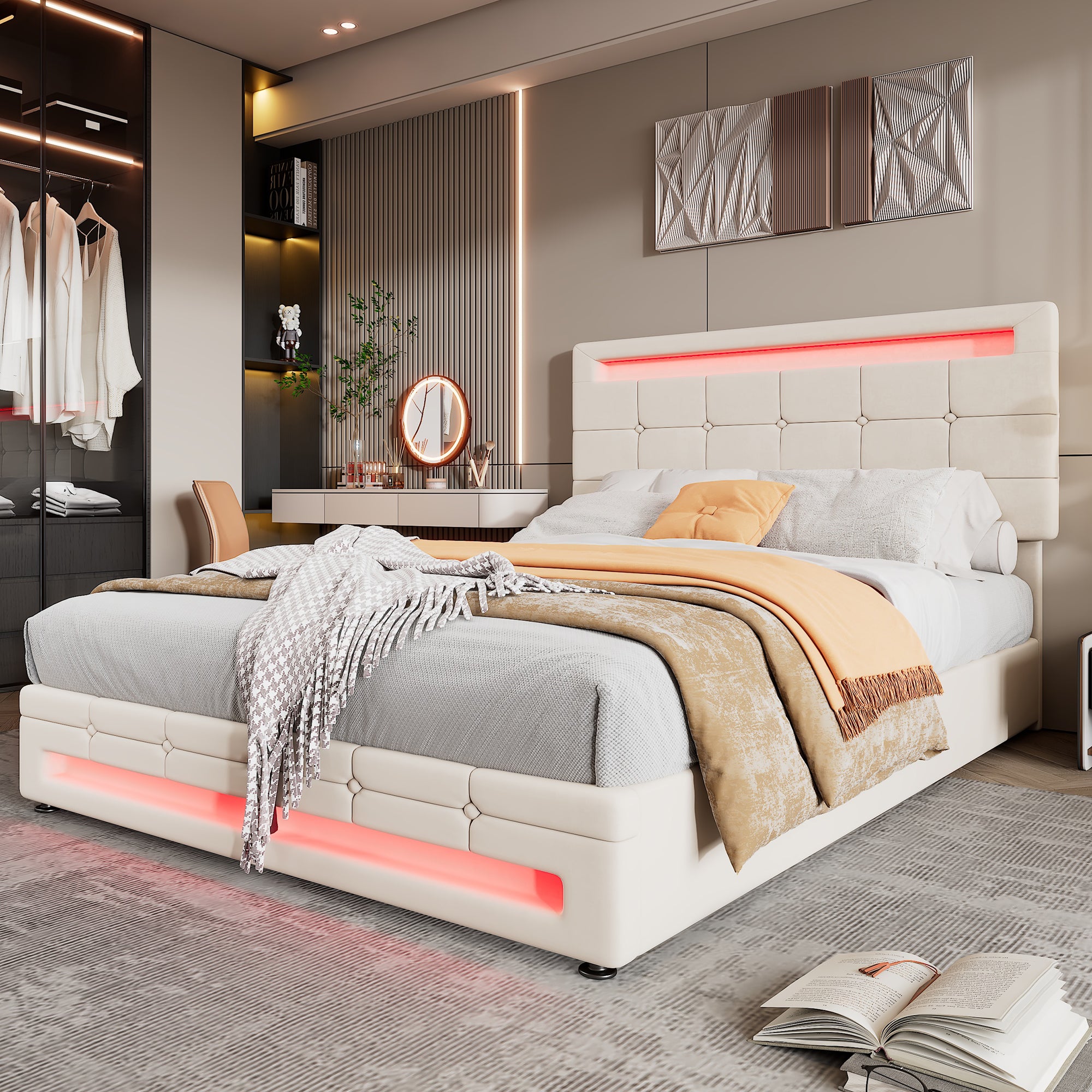 Upholstered Bed, Hydraulic 4ft6 Double 135x190cm with Square Embellishment & 7-Color LED, Velvet & Iron Beige