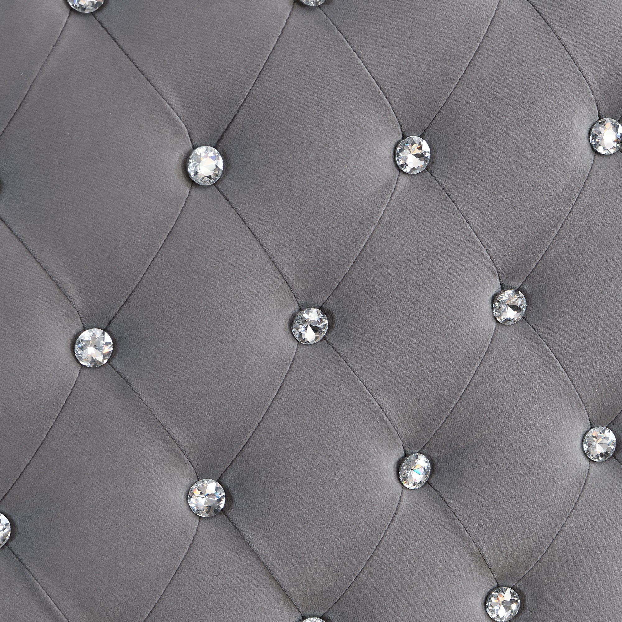 Elevate your bedroom with this upholstered double bed, crafted in soft grey velvet and adorned with elegant diamond inlays on the headboard. A thick, foam-padded backrest adds both comfort and style, creating a sleek and sophisticated centrepiece that blends effortlessly into modern interiors.