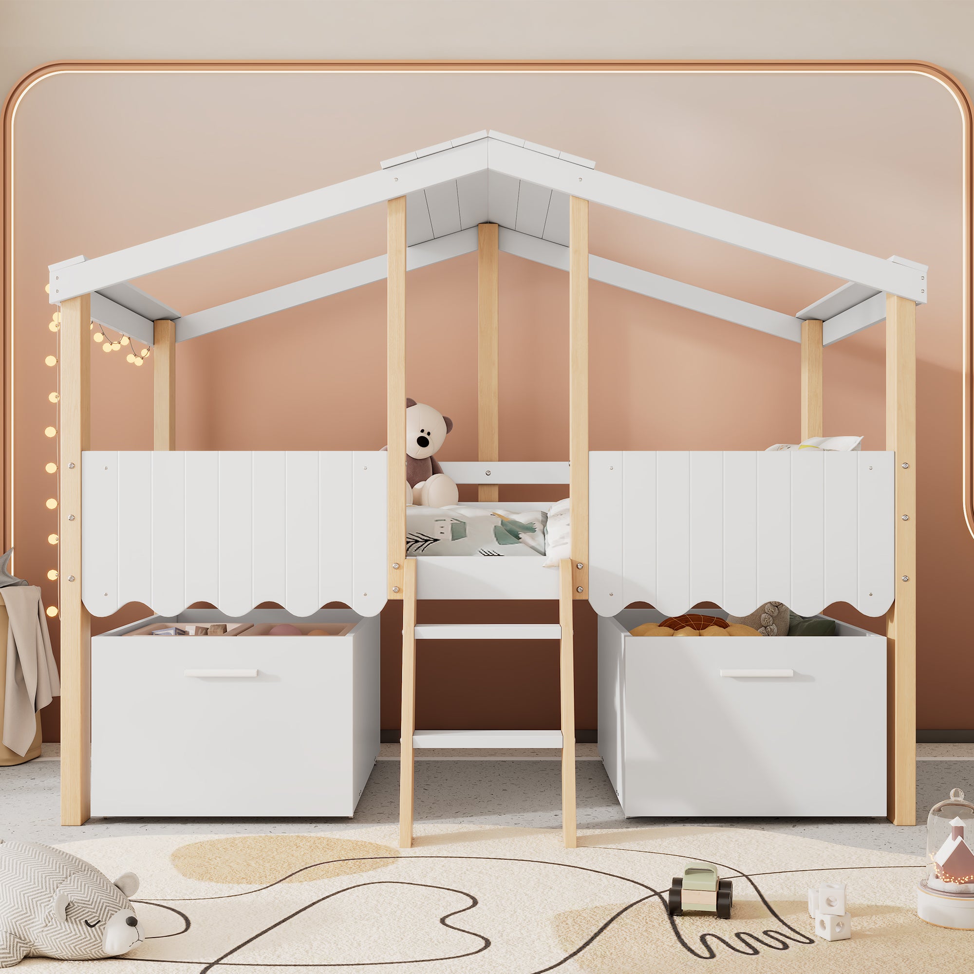 Wooden Storage Bed for Kids, 3ft Single 90x190cm with Safety Guardrail, 2 Wheeled Storage Boxes, and Imitation Roof, Pine Wood & Particle Board, White & Natural