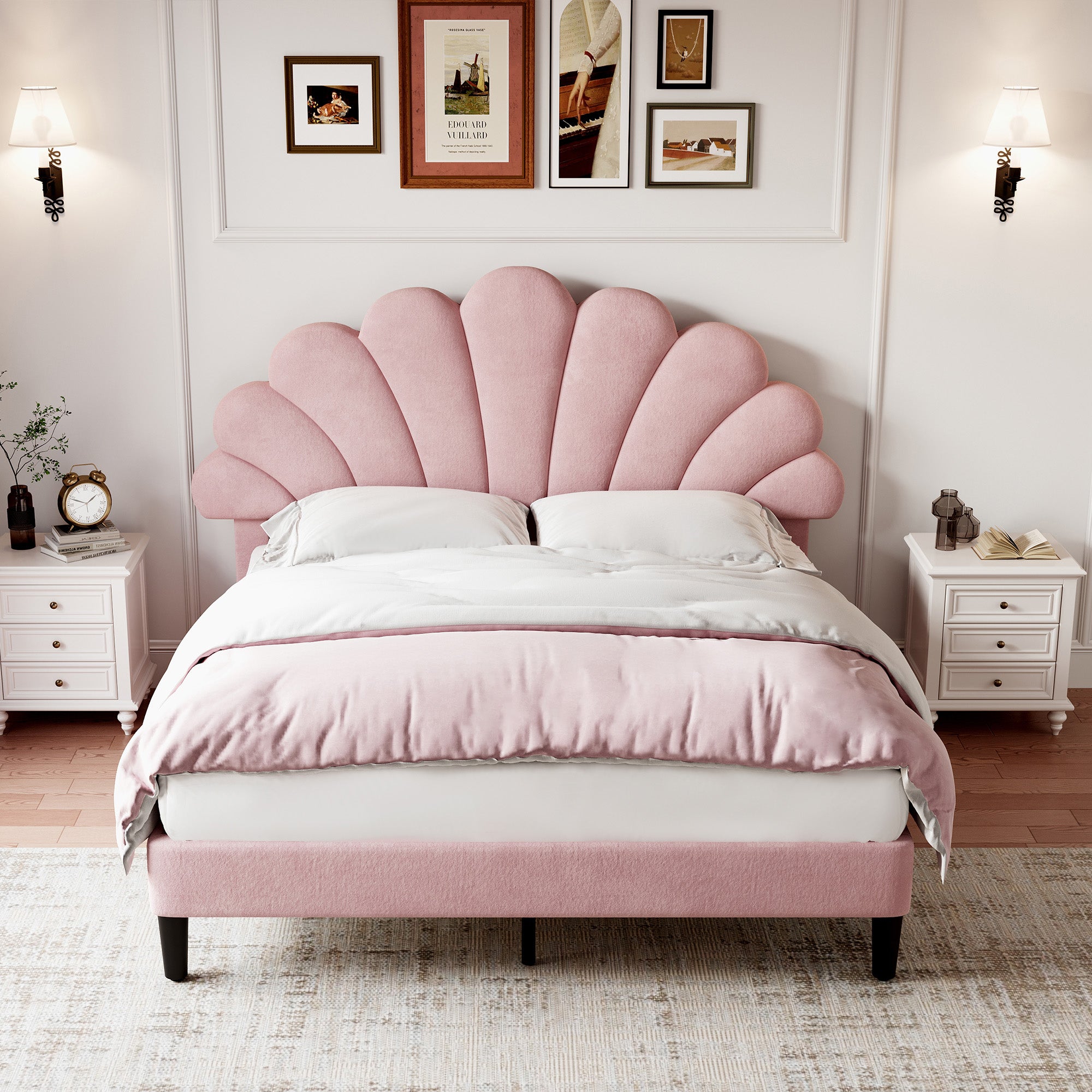4ft6 Double Upholstered Velvet Bed Frame, Adjustable Chic Petal Headboard, Pink