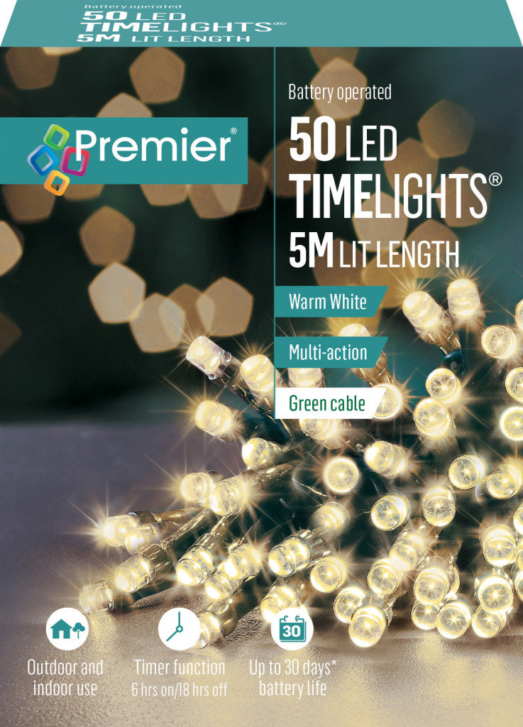 These Warm White 50 LED Battery Operated LED Lights with Timer will brighten up your home this Christmas. Highly suitable for any Christmas display either indoor or outdoor. These LED lights come with an energy efficient timer; 8 hours on, 16 hours off and 8 settings including static. With no plugs, it means no mess. No wires from the socket allows you to simply hang anywhere inside or outside your home