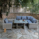 As beautiful as it is practical, The Kansas Corner Set makes no compromise on delivering a luxury outdoor dining experience. With seating for up to 6 people, this stylish modern sofa set is ideal for entertaining and bringing the family together in your outdoor living space. Designed with the best all-weather rattan, crafted from a high-quality rattan weave with varied textures and tones woven around 1.2mm thick frames that are powder-coated. The tabletop is made of 5mm tempered glass for safety.