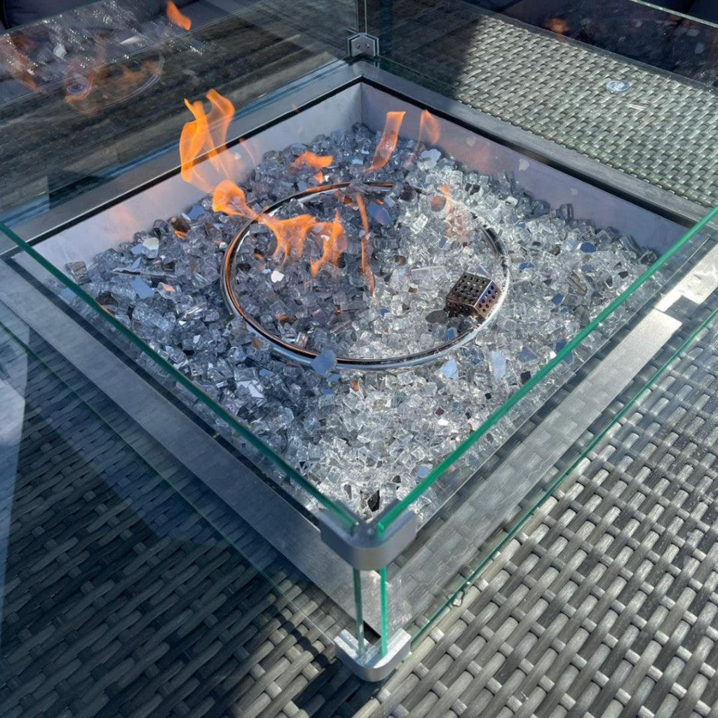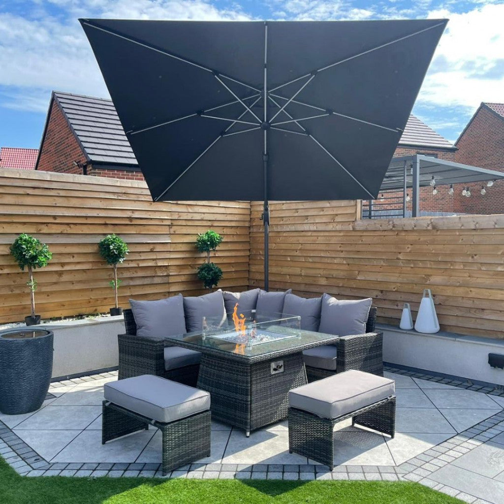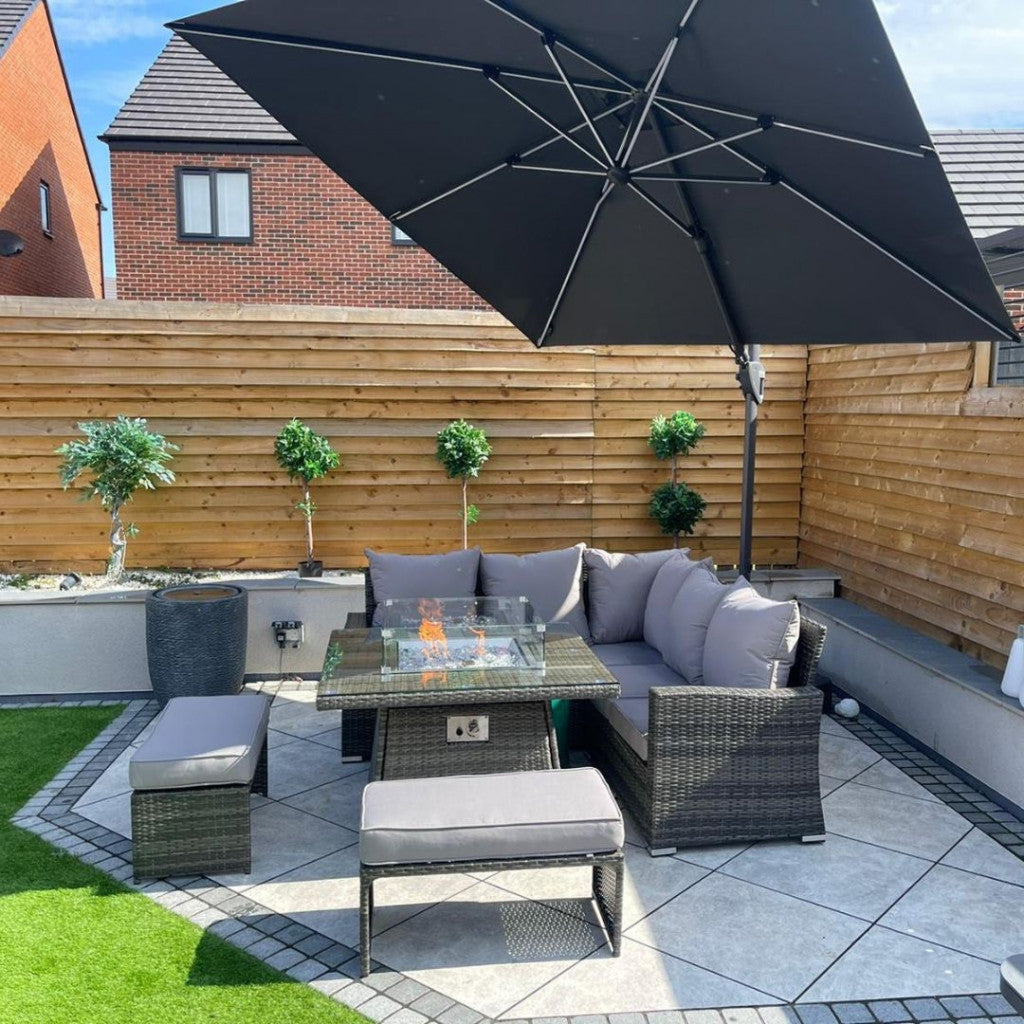 Transform your outdoor living space into an inviting haven with the Parma Corner Sofa Set featuring a Square Firepit Table in Grey. Extend your evenings with the comforting warmth of a fire table and sink into the deep, sumptuous seating, enjoying the ambiance of a fire without the mess.