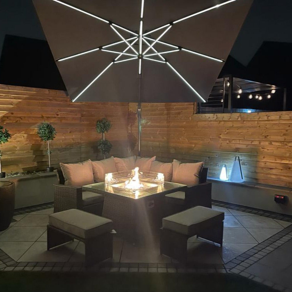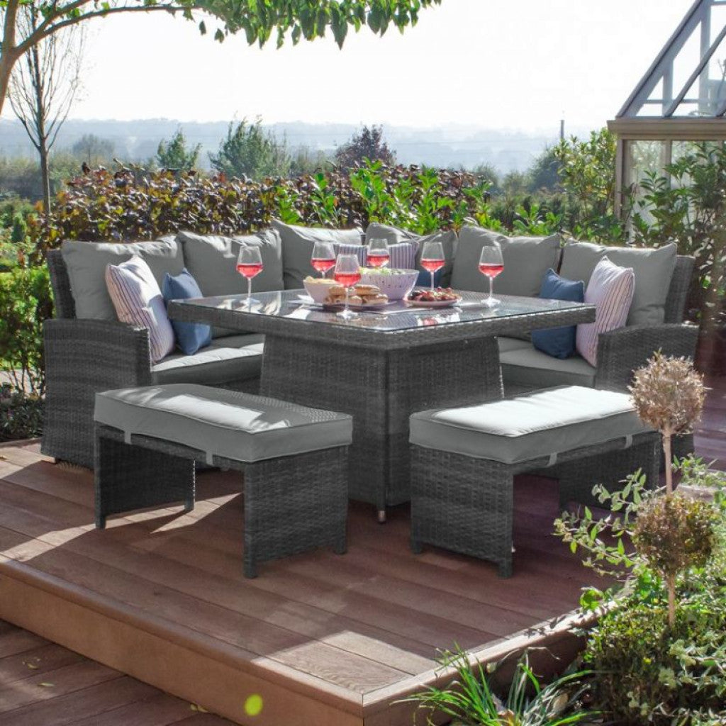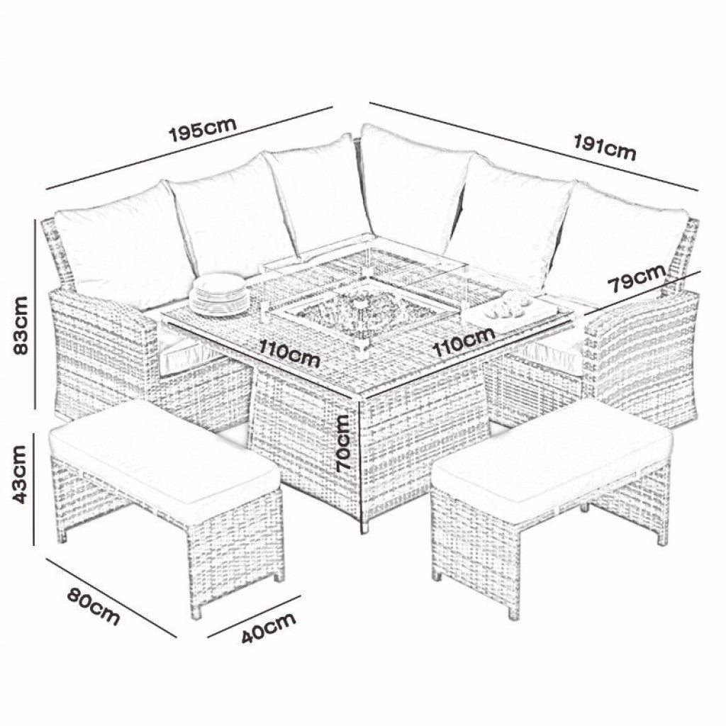Transform your outdoor living space into an inviting haven with the Parma Corner Sofa Set featuring a Square Firepit Table in Grey. Extend your evenings with the comforting warmth of a fire table and sink into the deep, sumptuous seating, enjoying the ambiance of a fire without the mess.