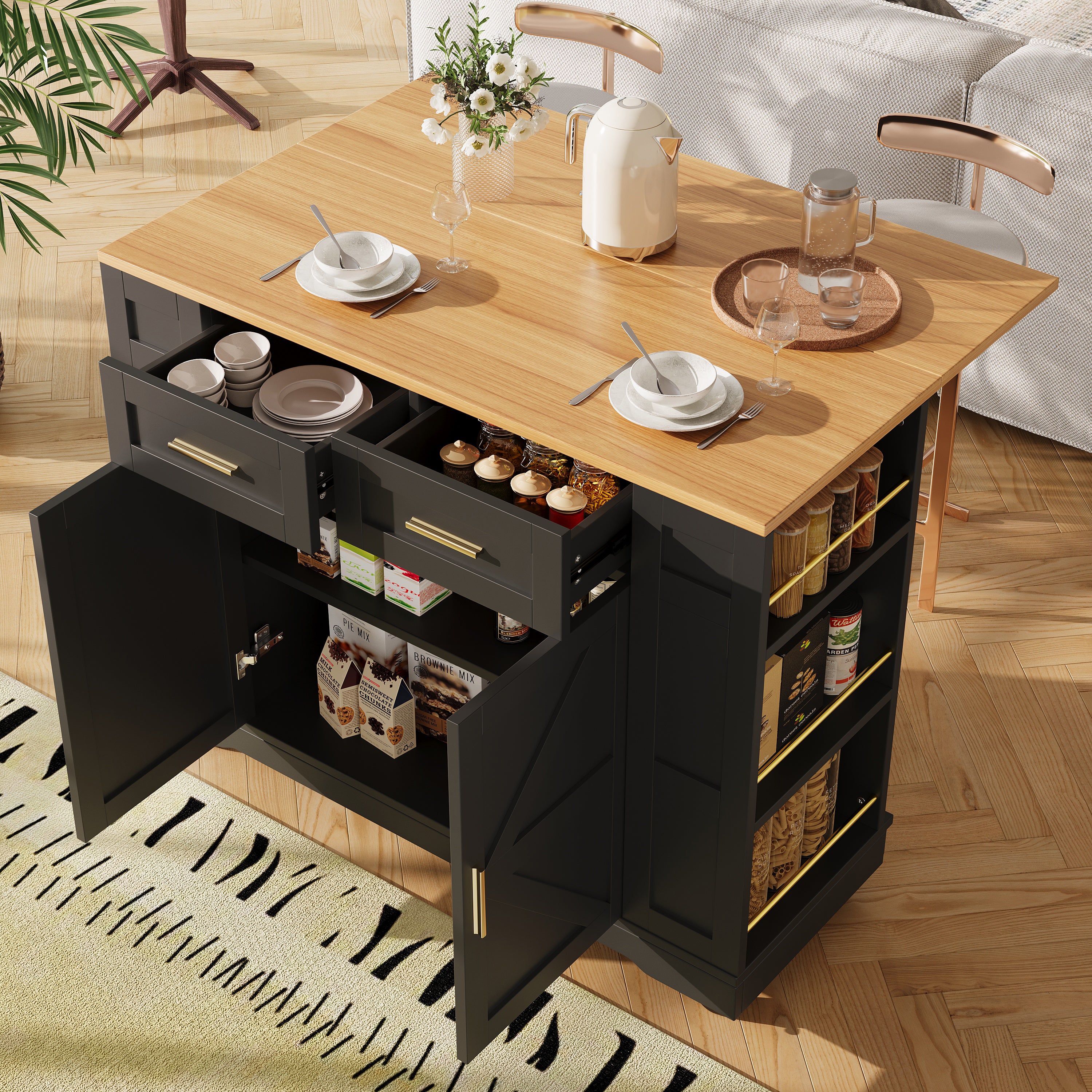 Kitchen Island on Wheels with 2 Drawers, Double-Sided Storage Racks, Foldable Worktop, Black