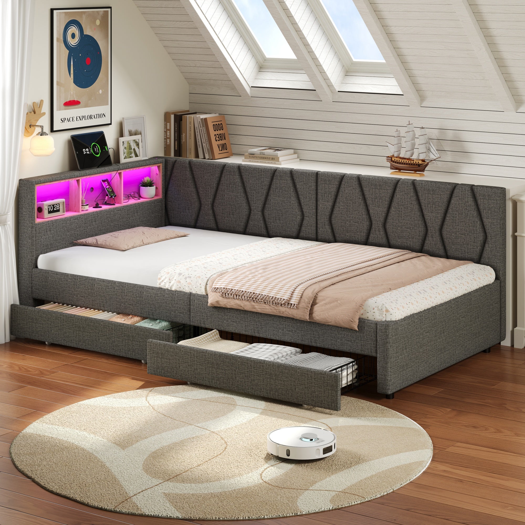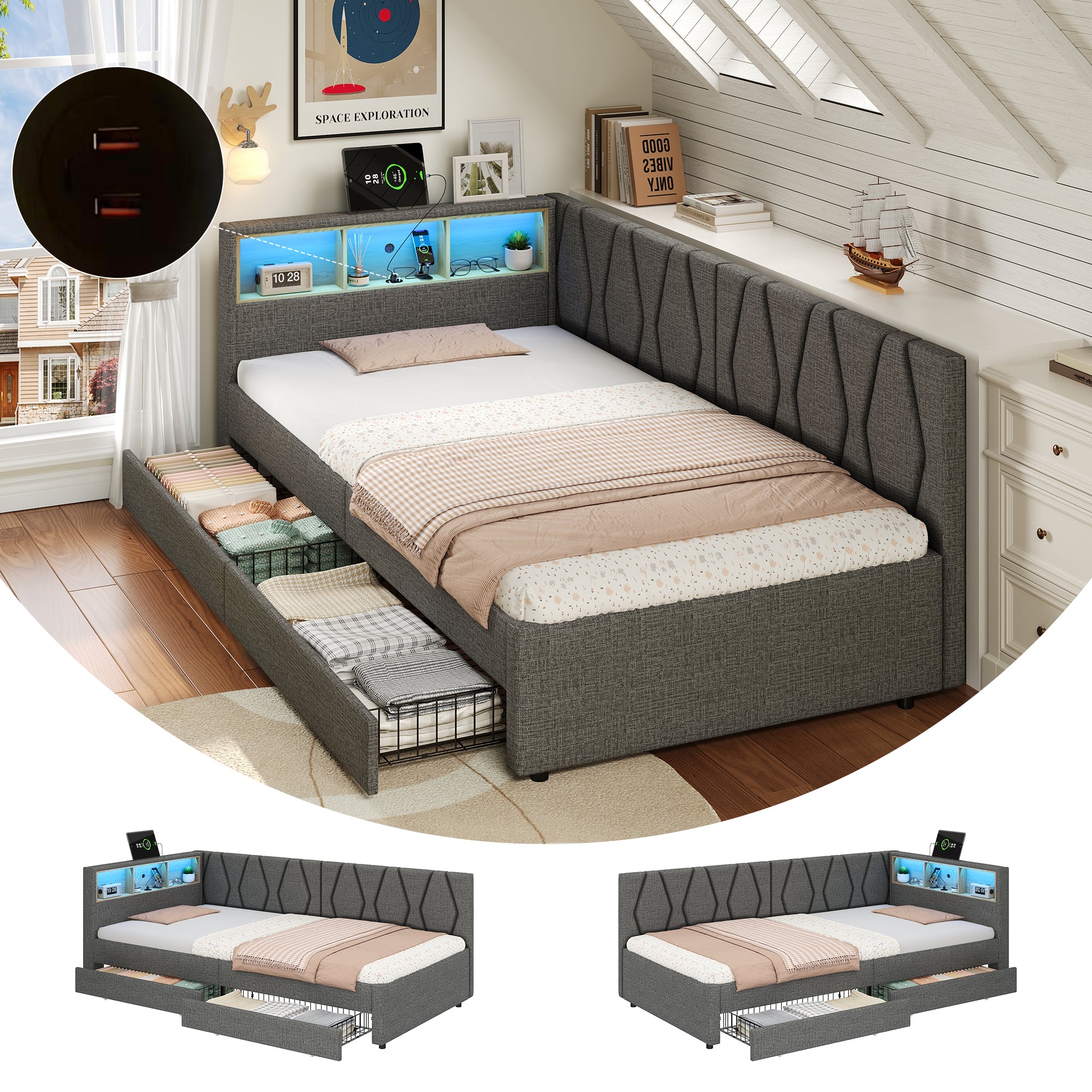 3ft Single Daybed with Two Storage Drawers, LED Modern Bed frame with Charging Station, Linen Sofa Bed, Grey