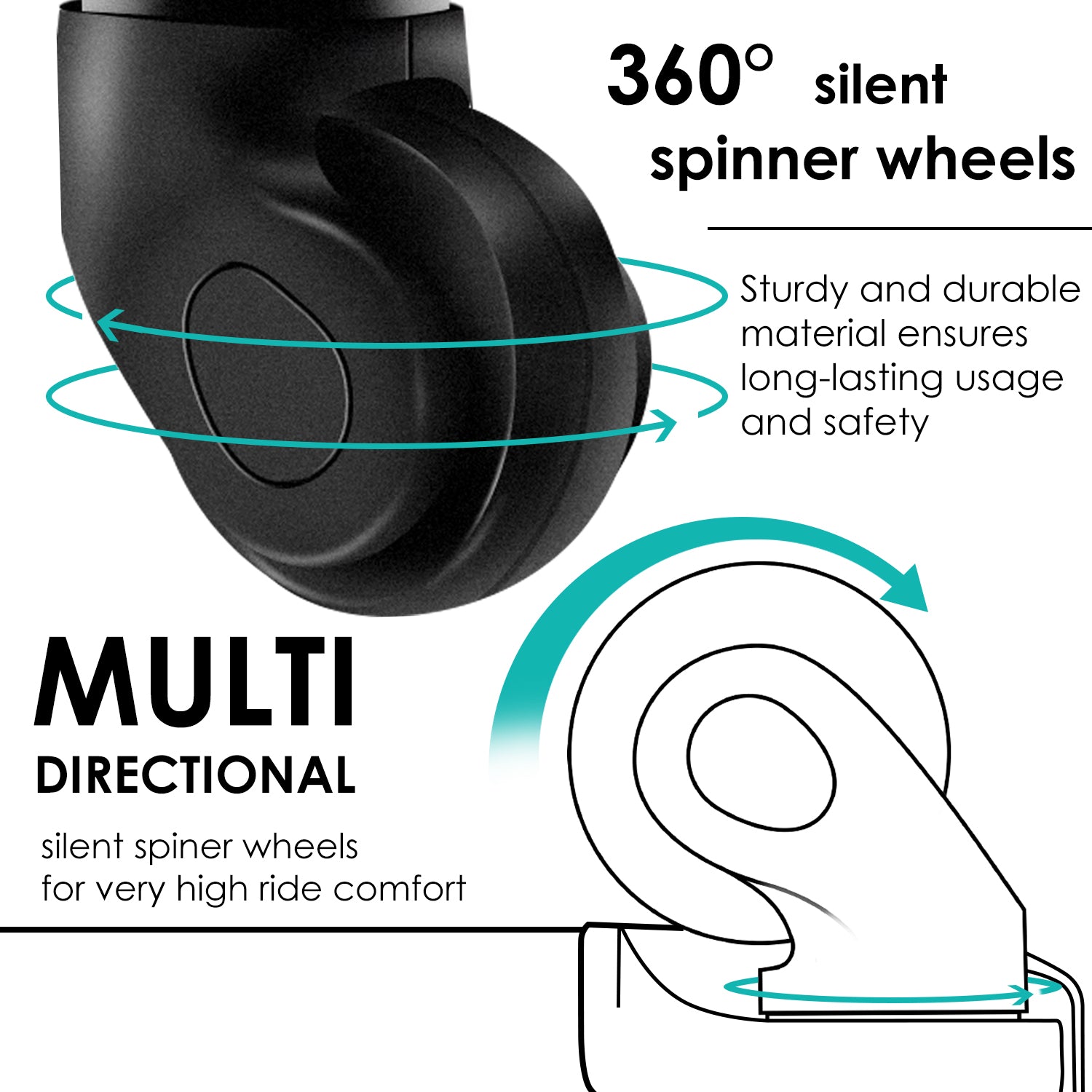 Silent Universal Wheel:The silent gimbaled wheels are designed to glide quietly and smoothly,providing peace of mind and a quiet journey.