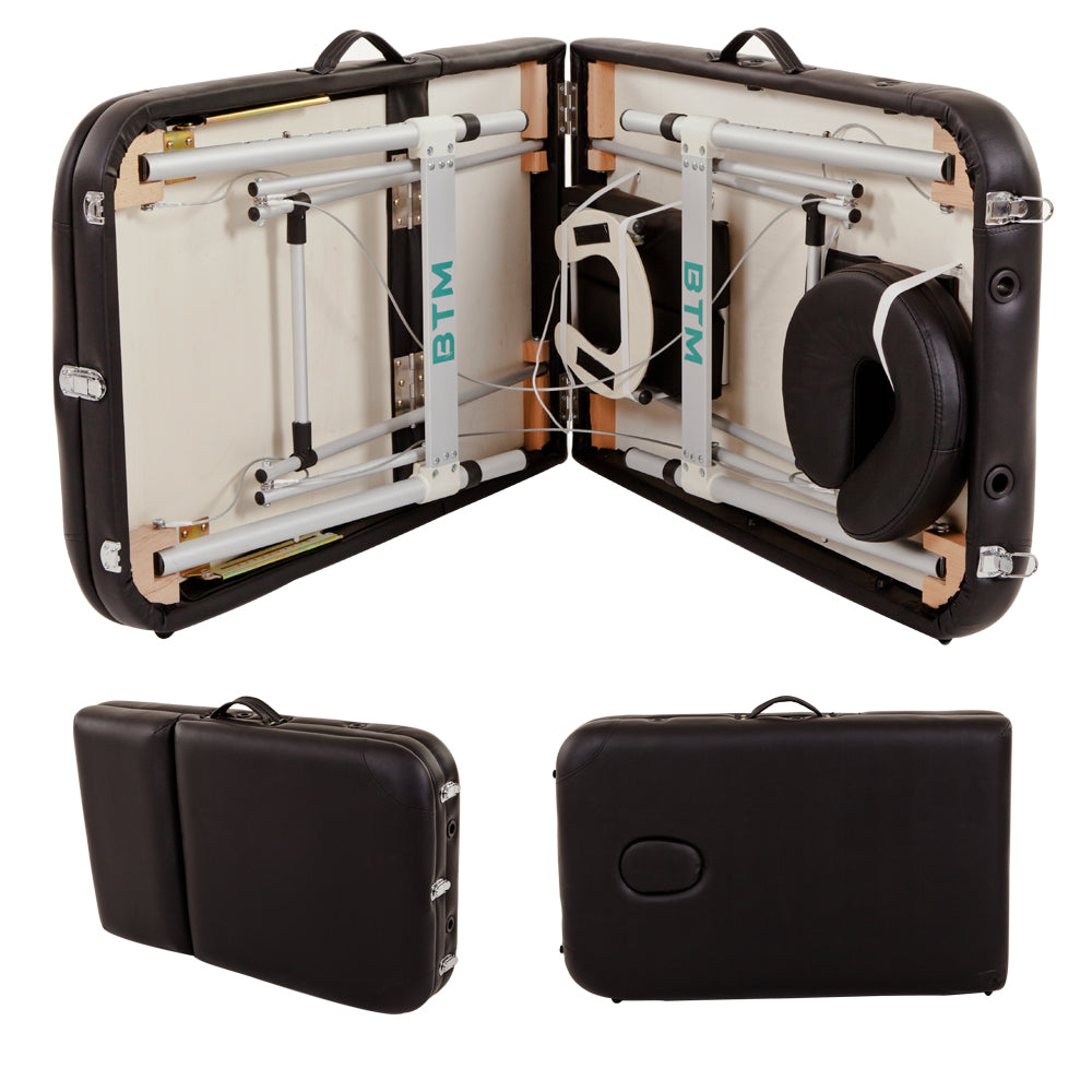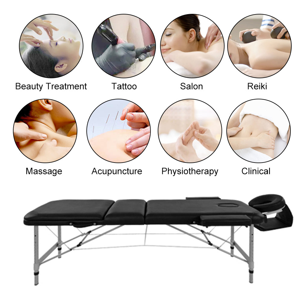 Product Name:Massage Table Couch Bed Aluminium Tattoo Spa Reiki Portable Folded 3 Section with Premium PU Leather and 5 cm High Density Multi-Layer Foam Headrest Arm support and Carrying Bag Black