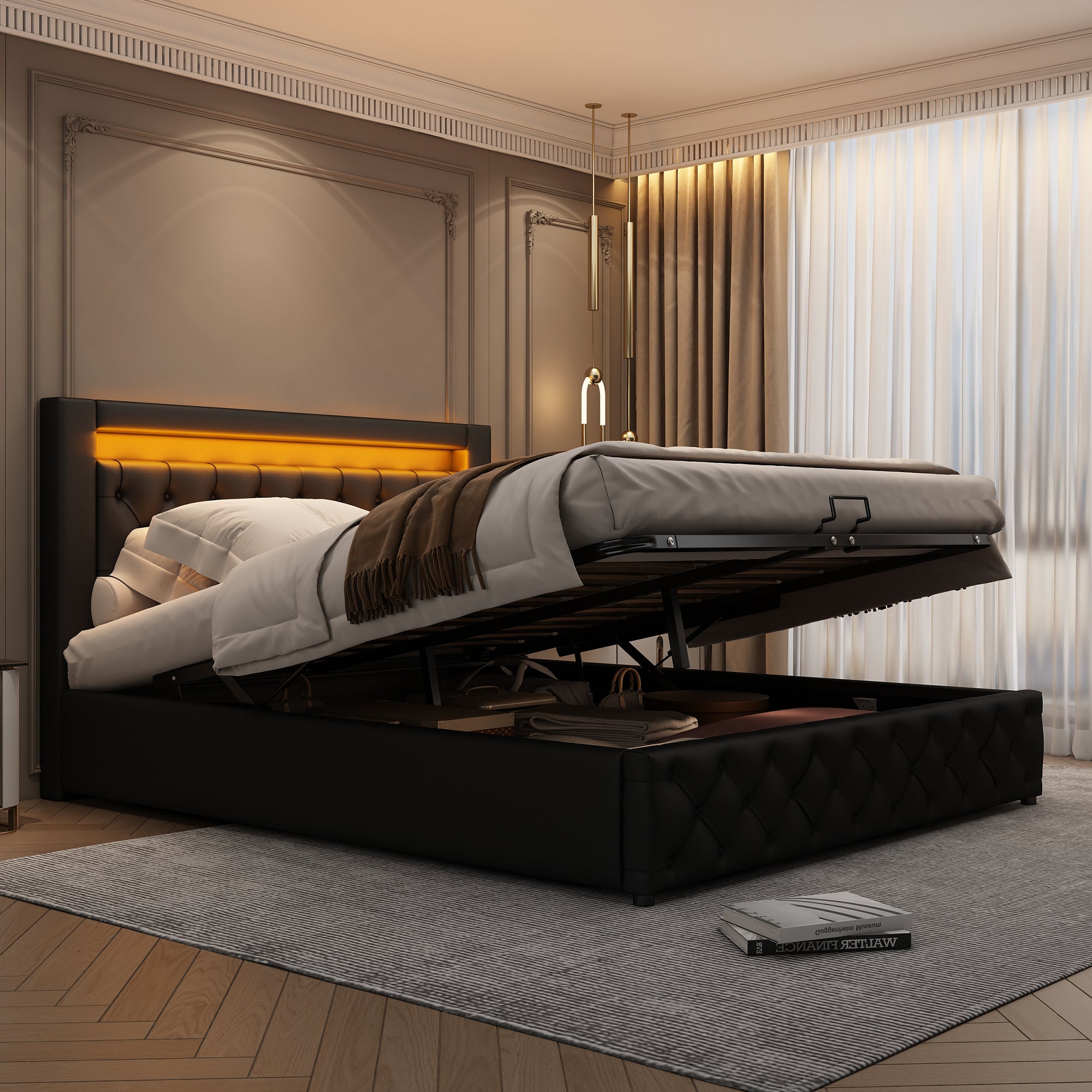 Upholstered Bed, 135x190 cm, Functional with Slatted Frame, Storage, LED Lighting, Black PU