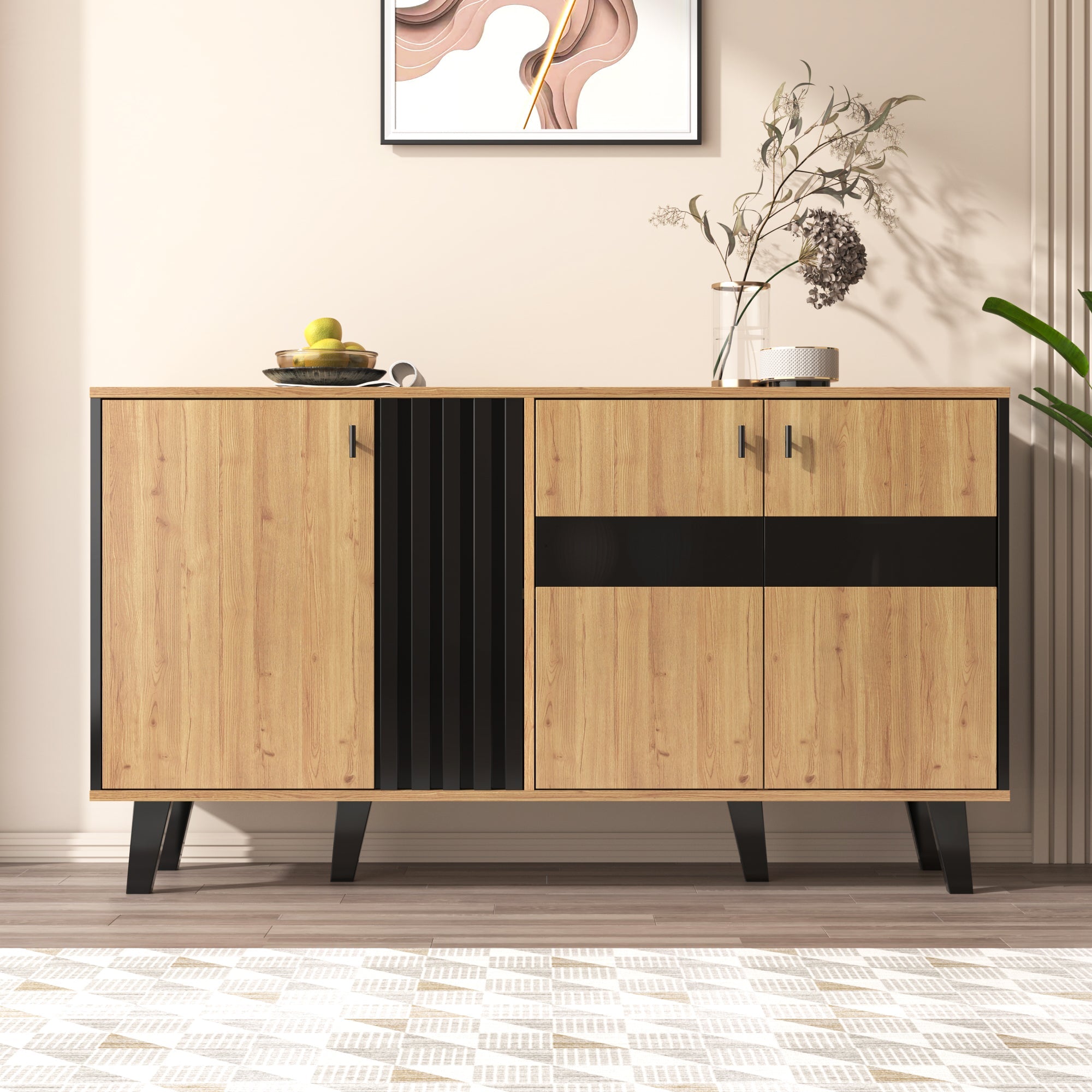 Sideboard with Storage, LED Light, and Glass Cabinet, Wood and Black