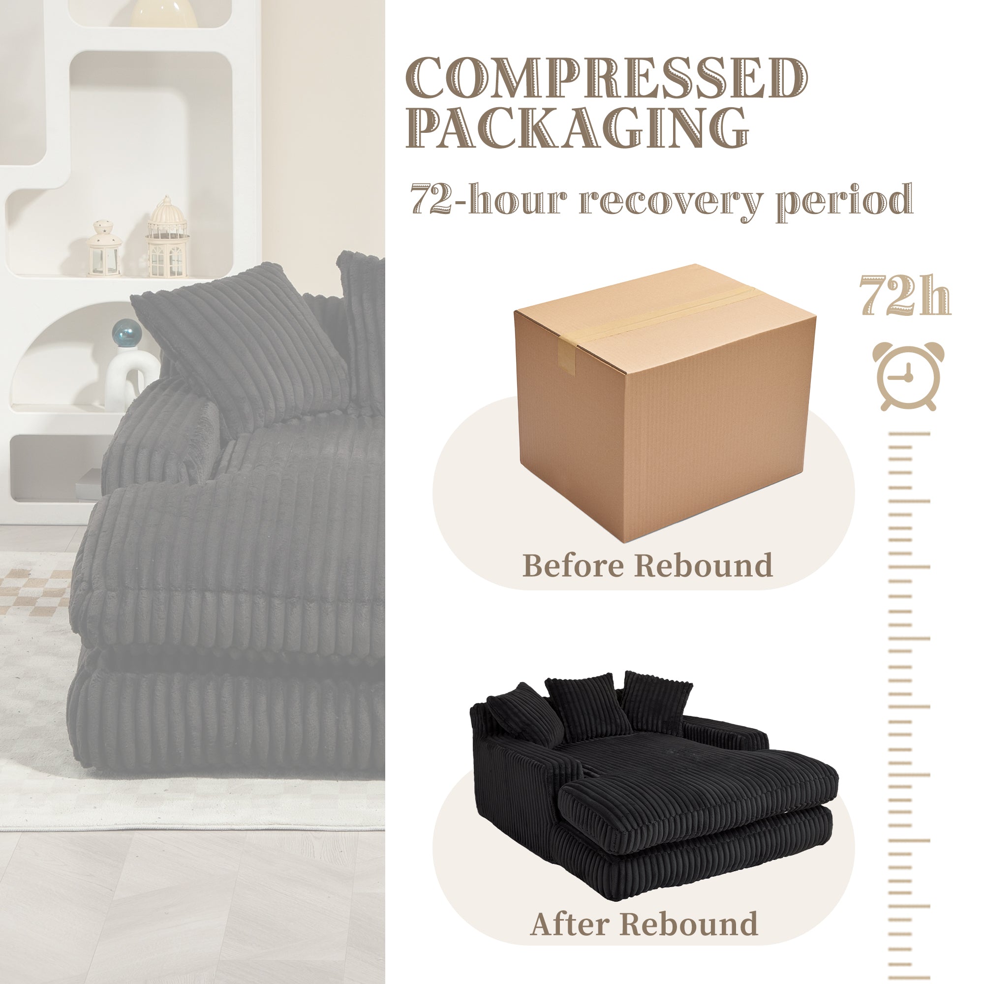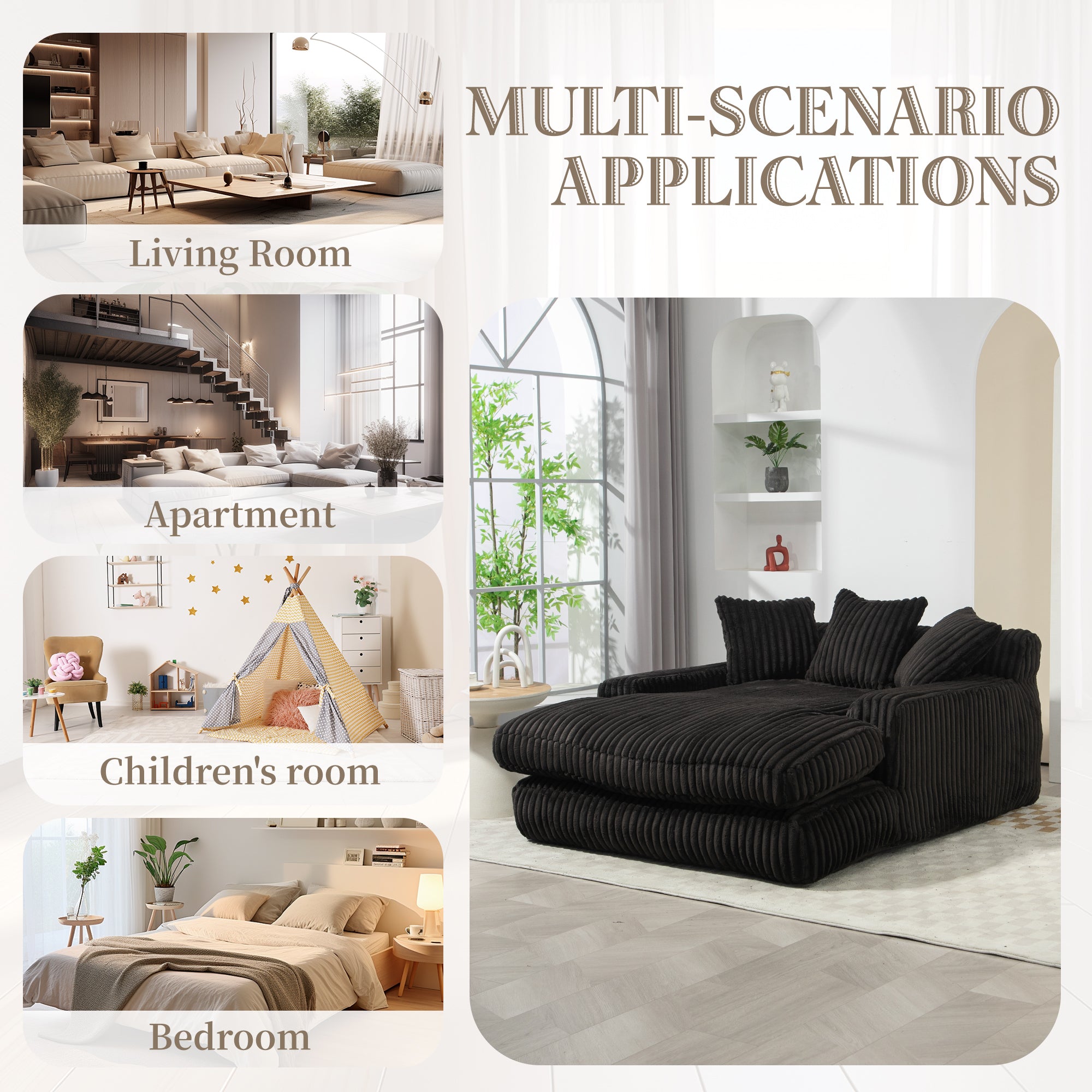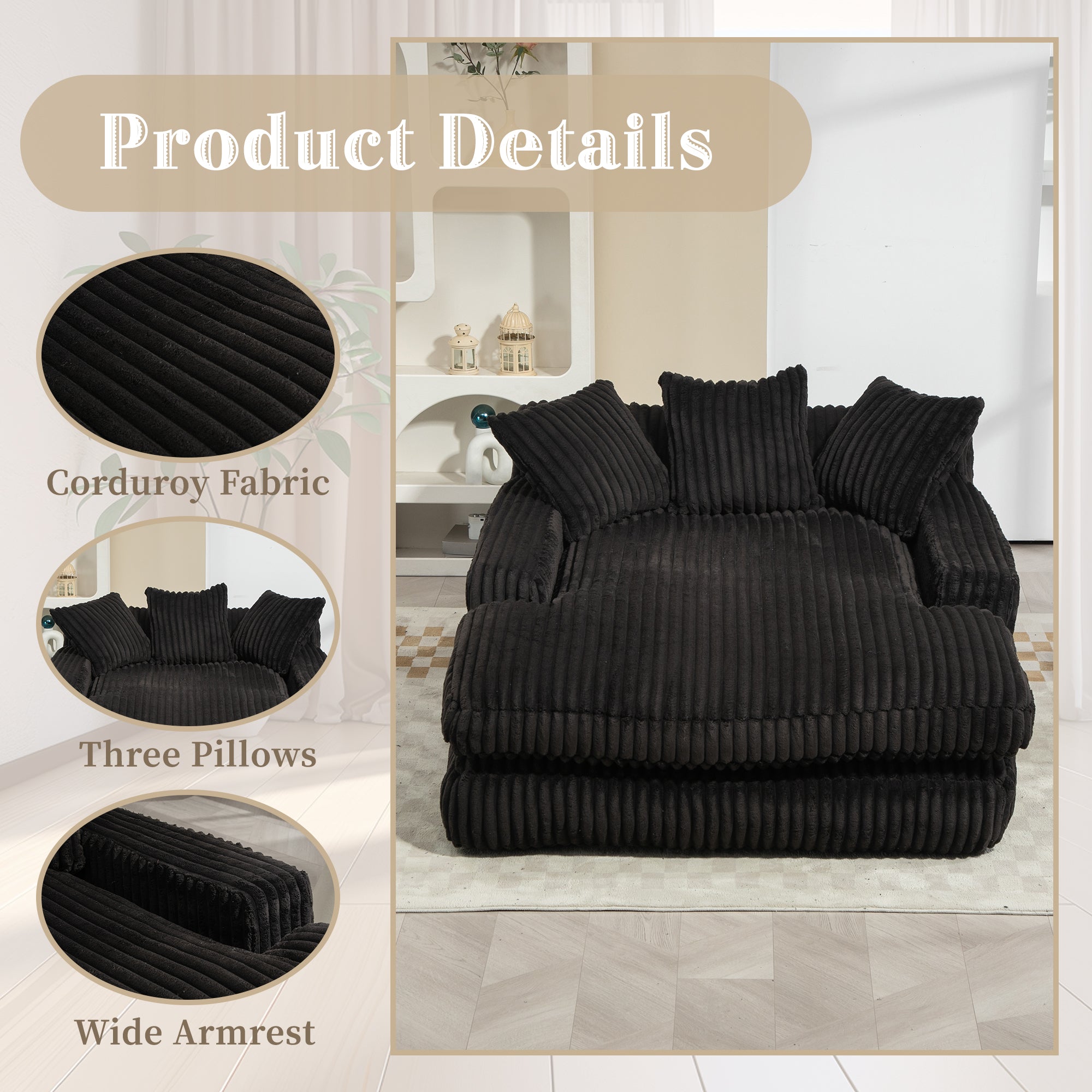 GOMYWAY Chaise Lounge Sofa Sleeper Chair with 3 Throw Pillows, Black Corduroy
