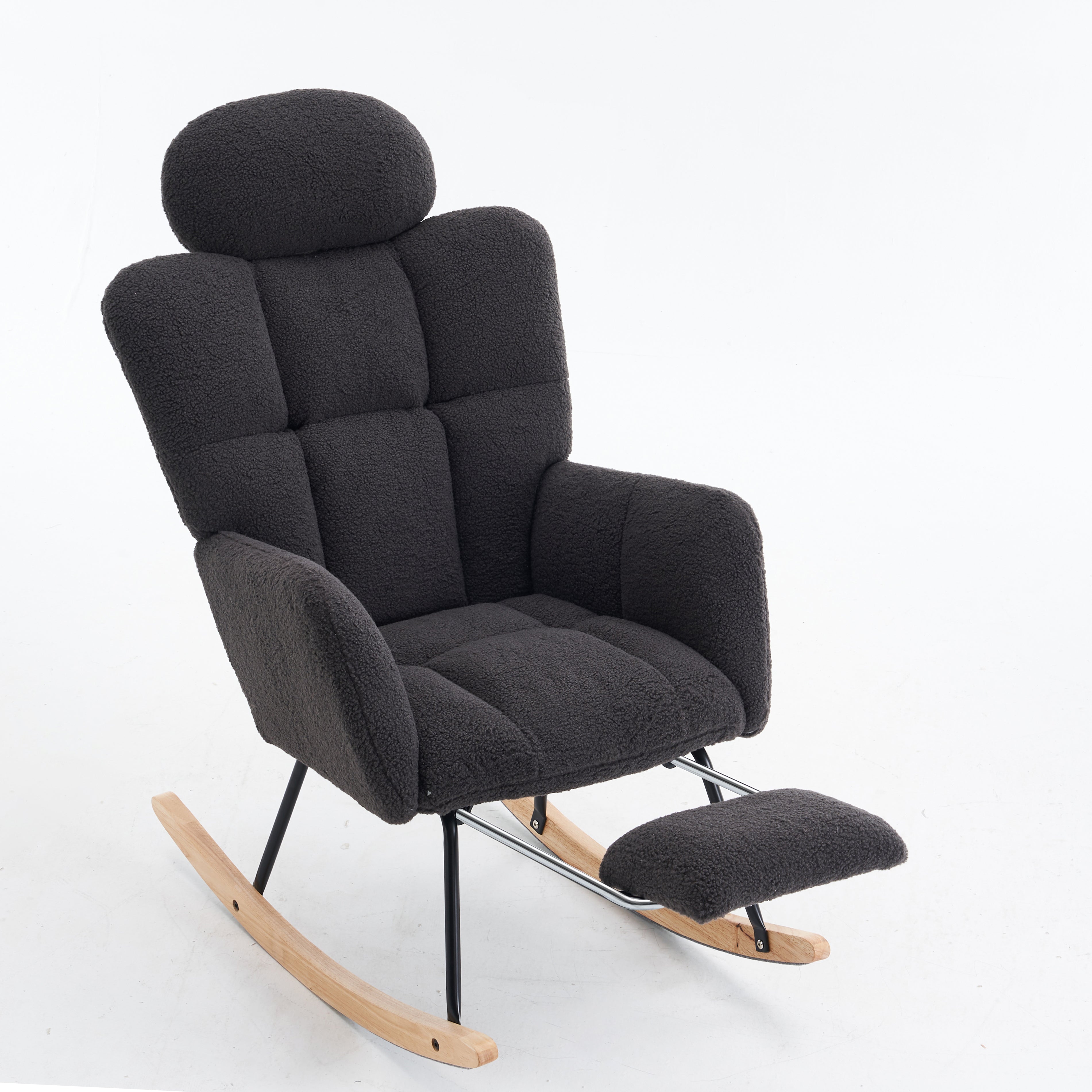 Teddy Rocking Chair Tufted Upholstered Padded Seat Headrest Foldable Footrest, Dark Grey