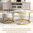 2-in-1 Round Coffee Table with Marble Grain Veneer Top, Rattan Drawers, Solid Wood Handles, and Gold Iron Legs
