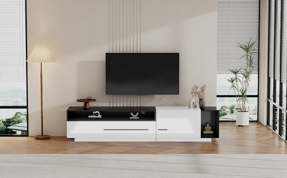 70 Inch High Gloss TV Stand with 2 Closed Storage Spaces, 1 Door, 1 Drawer, White+Black Particle Board