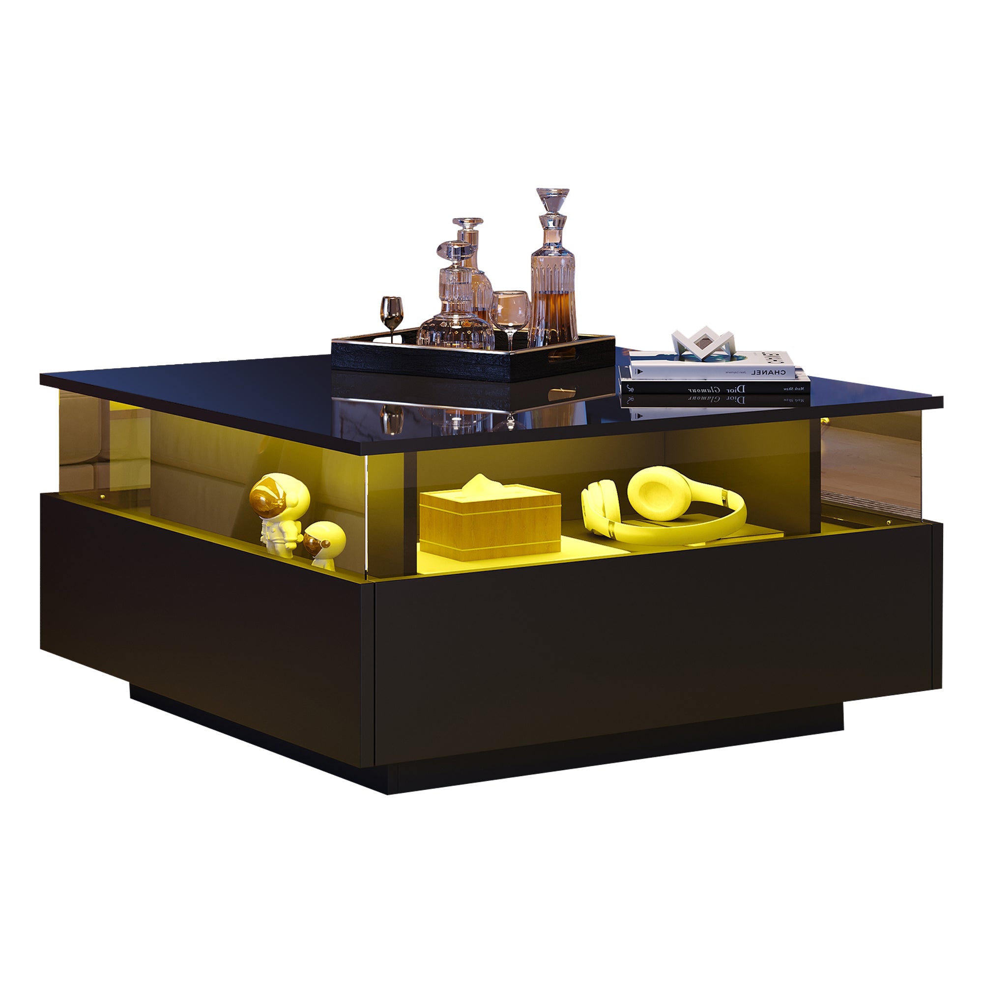 Coffee Table with Storage, Modern LED Coffee Table with 2 Sliding Drawers, Black