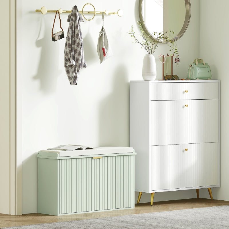 Elegant: A boxy-shaped slim shoe storage unit, featuring a ridged front and a gold-colored handle. This bench is a beautiful and practical addition to hallways, bedrooms, and other living spaces.
