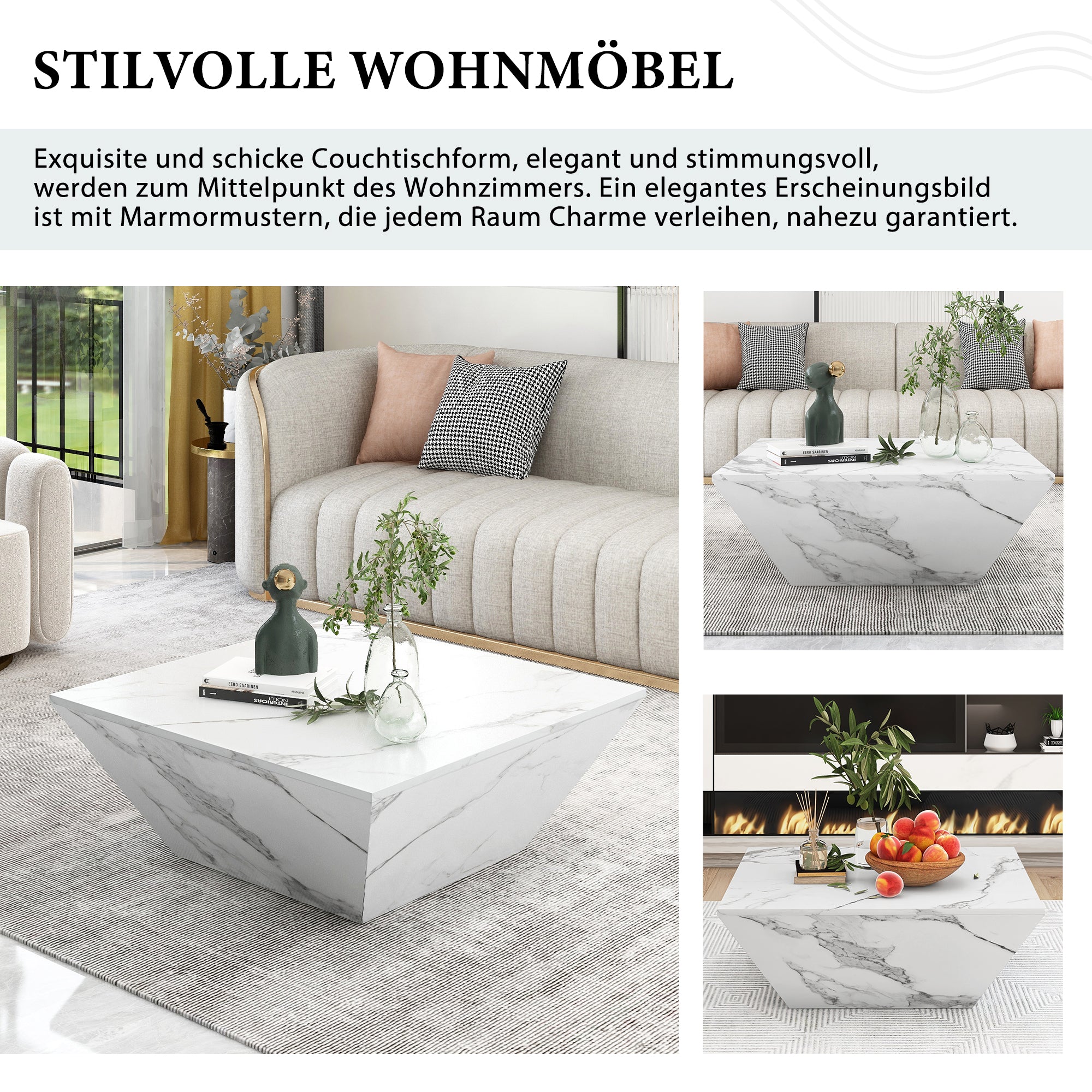 - Unique Design The trapezoidal high gloss marble veneer coffee table and the design is unique and high quality and elegant. It is an inaccessible element in the living room and enhances the texture of the house. Marble grain pattern, brings modern concise artistic sense to your home