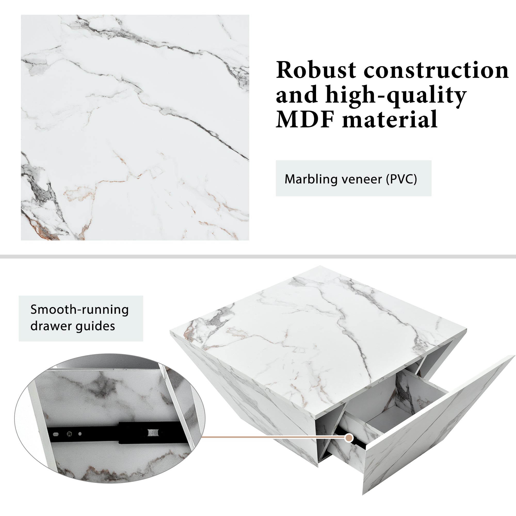 - Durable and Long-lasting Marbling veneer MDF body, not easily deformed and cracked, internal structure is compact, greatly improves stability, solid and durable. Sturdy base, unlike traditional leg bases. Drawer Storage Capacity2 marble veneer drawers can easily meet your daily storage needs.