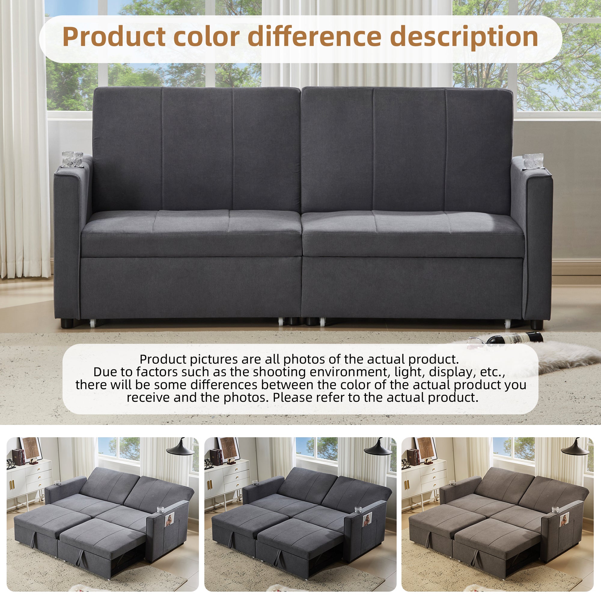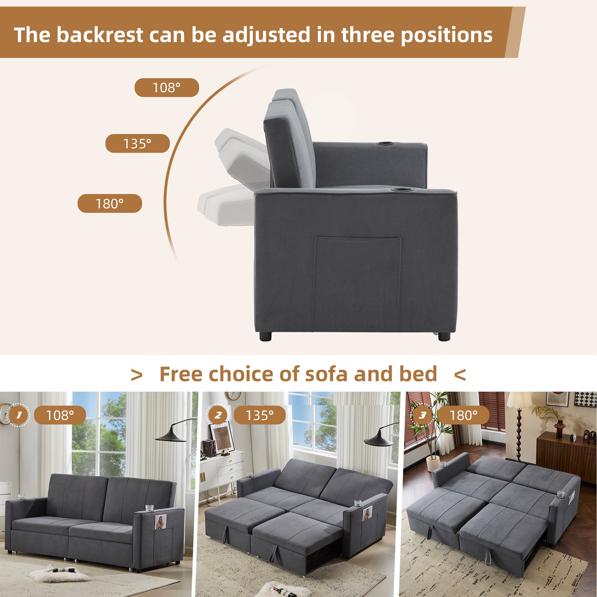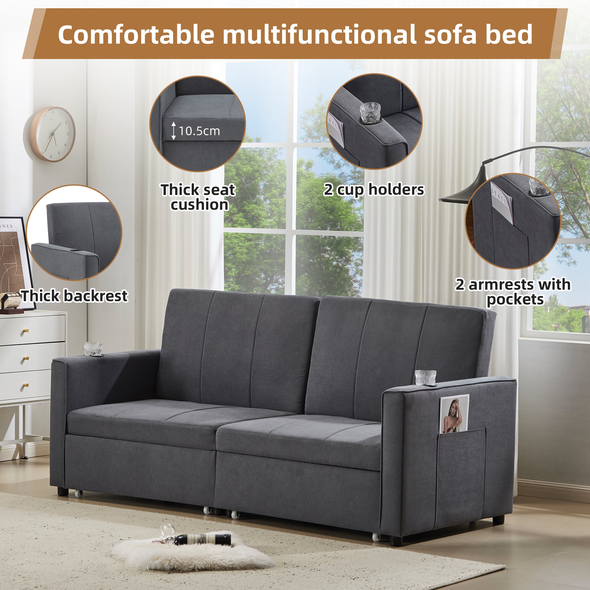 Pull Out Sofa Bed - 207cm King Size, Convertible, with Cup Holders & Side Pockets, Fabric