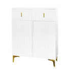 This elegant sideboard boasts a sophisticated design, featuring two drawers and two doors, each beautifully adorned with textured paneling. Inside, two adjustable shelves provide customized storage solutions, making this piece highly versatile for use as a sideboard, shoe cabinet, or even a dressing table, adapting seamlessly to a variety of living scenarios. The doors are equipped with soft-close hinges, ensuring a secure and smooth closing mechanism and preventing sudden closures. Furthermore, the cabinet incorporates a push-open mechanism, eliminating the need for visible handles to maintain a sleek, monolithic appearance. The gold-plated handles and legs not only facilitate ease of use but also add a touch of luxury and elegance, making this sideboard a perfect blend of functionality and style.
