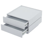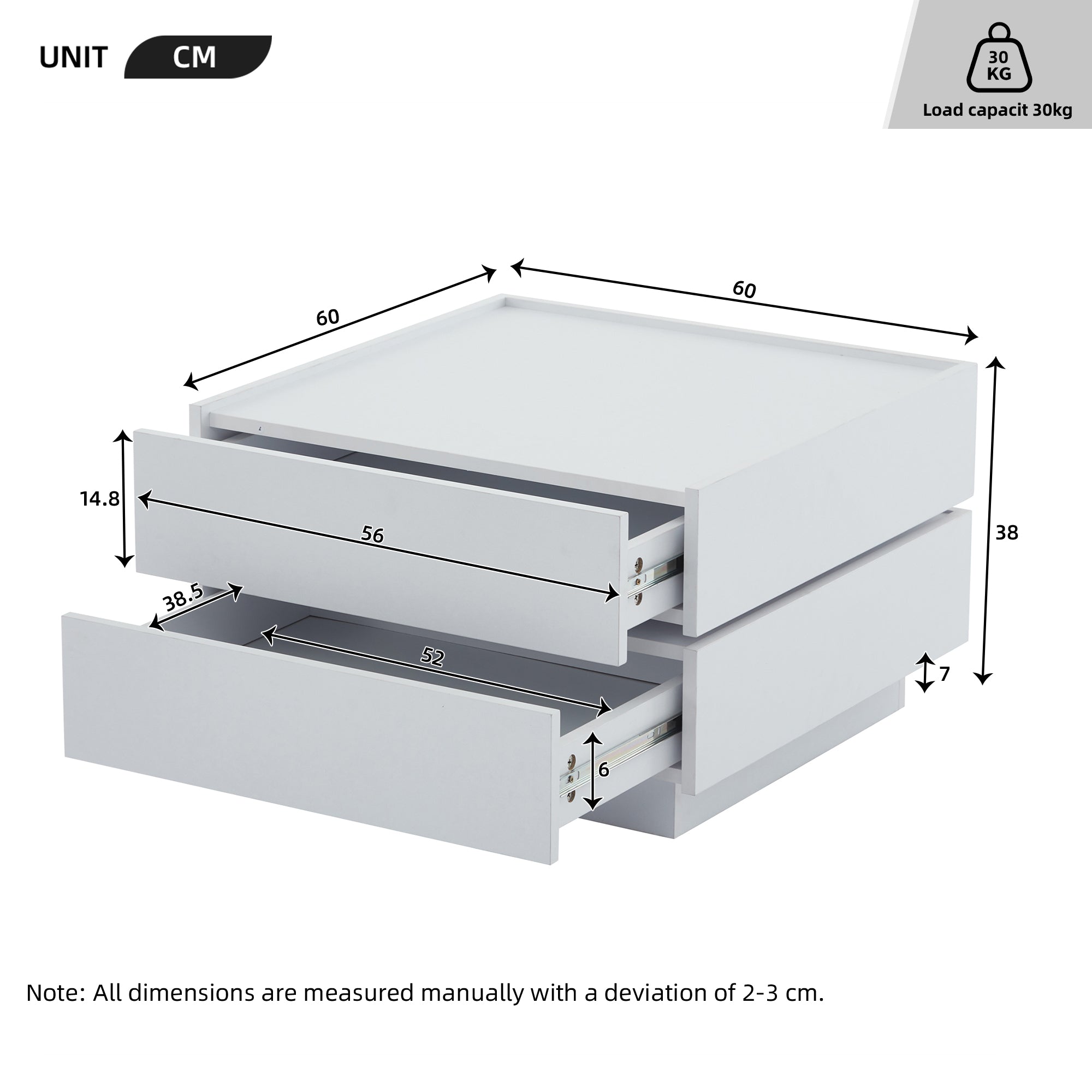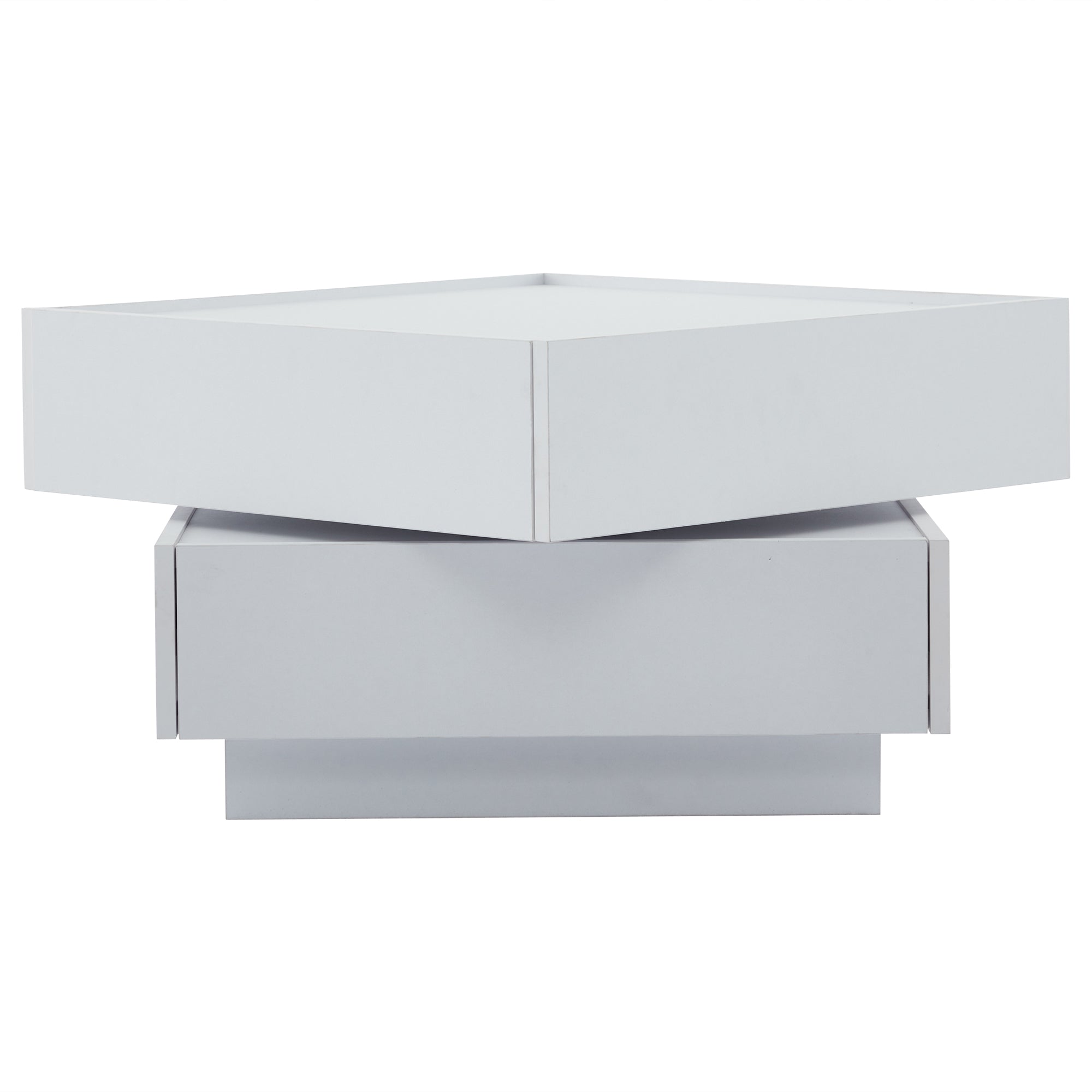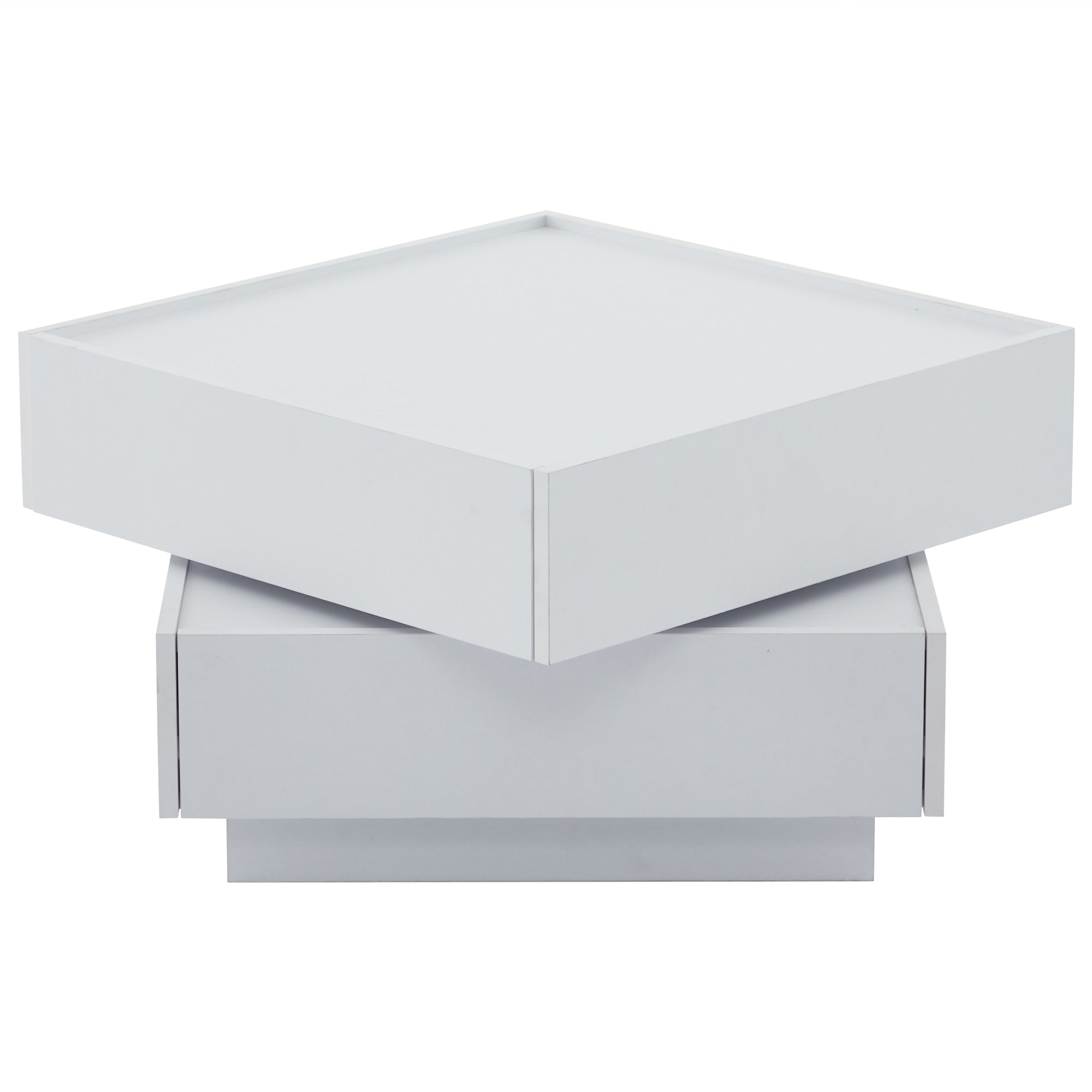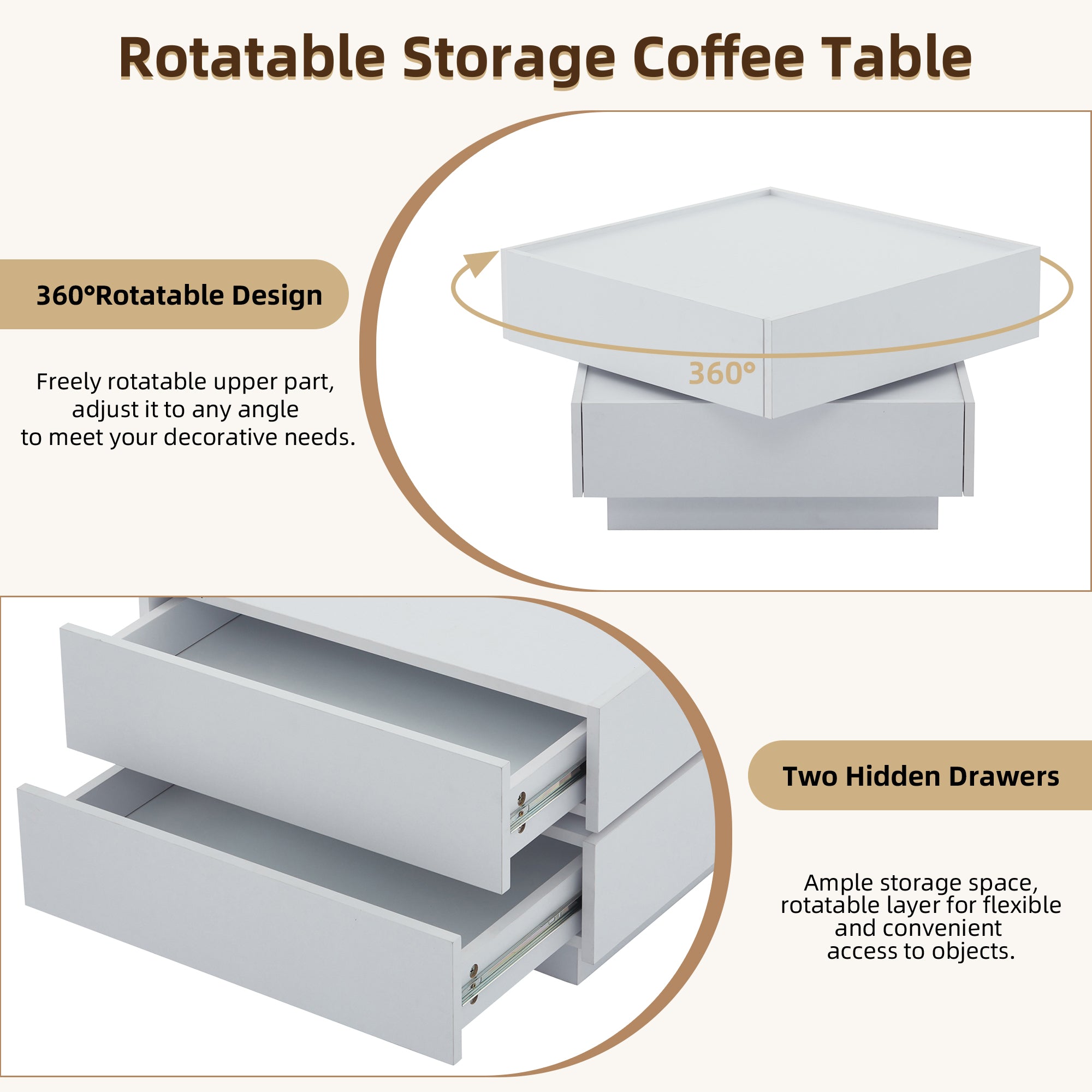 Square 360° Rotating Coffee Table with 2 Drawers, Wooden 2-Tier with Swivel Tabletop and Storage, White
