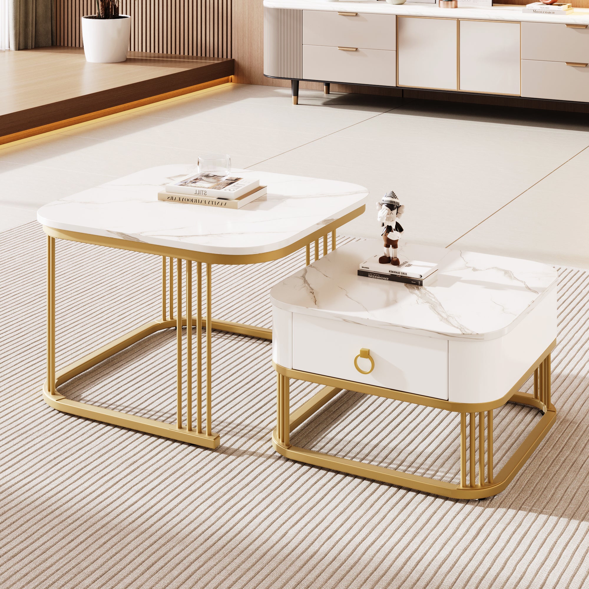 Elegant nesting Coffee Table: Marble Look, Gold Decor, Side Table with Drawers - Set of 2