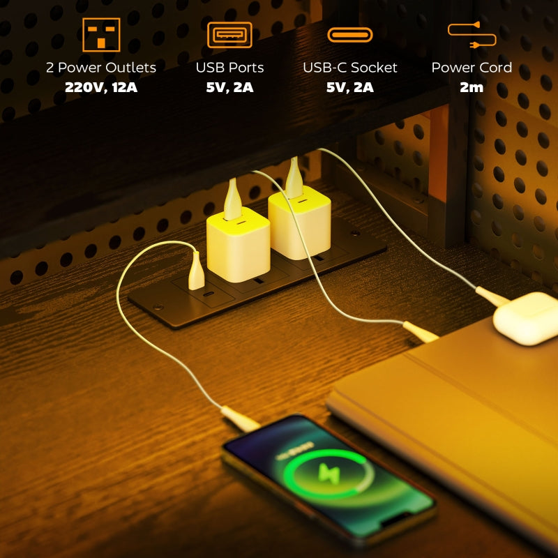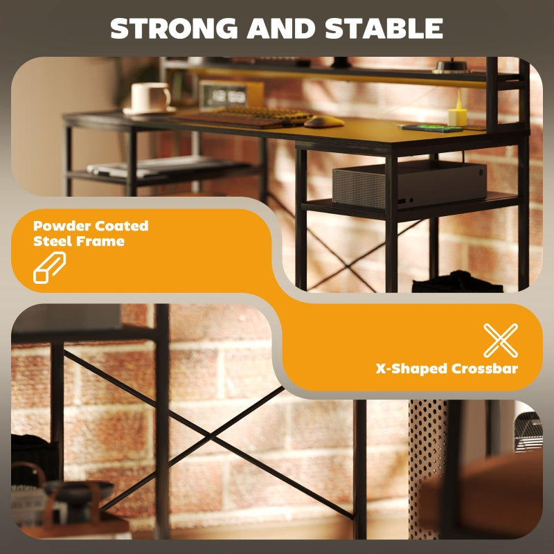 Computer Desk with Power Outlets, LED Lights, Monitor Stand, Storage, Black