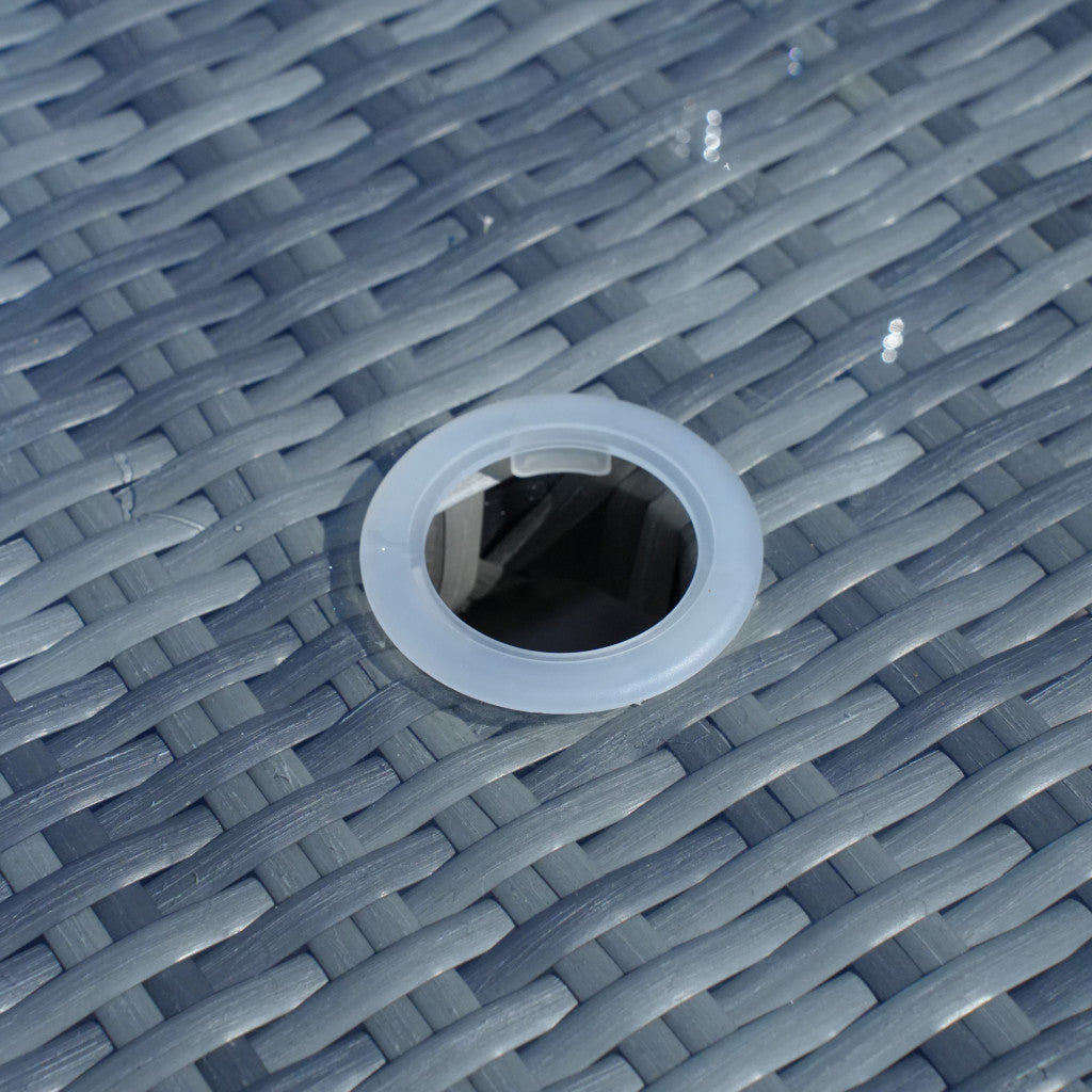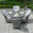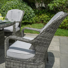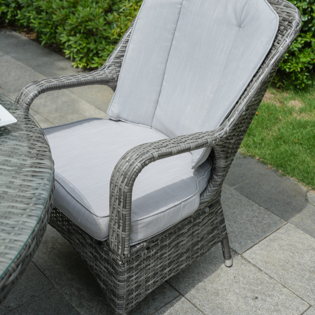 Introducing the Parma 4 Seater Dining Set with a 120cm Round Table in Grey, where luxury meets comfort for your outdoor oasis. This elegant dining ensemble accommodates four people, ensuring a cosy and enjoyable dining or lounging experience. The high-back chairs offer exceptional comfort with the extra padding on the base and back cushions and added lumbar support to cradle your upper body. The glass-topped table features a parasol hole, to keep you comfortably cool and shaded during the heat of summer days.