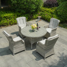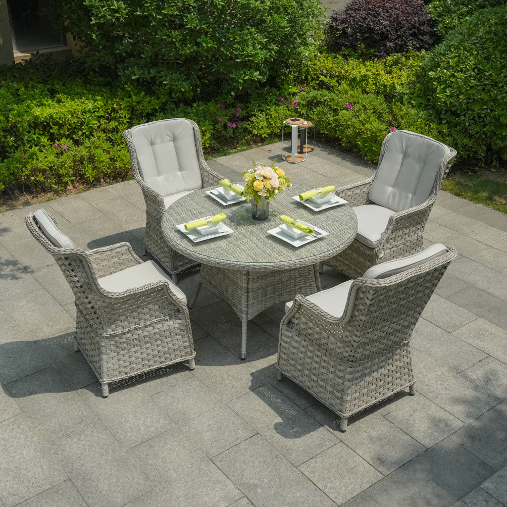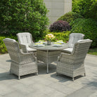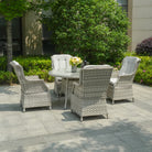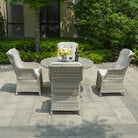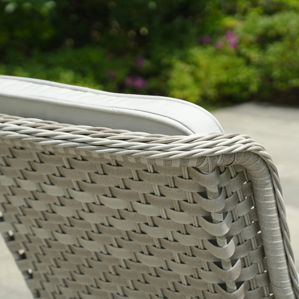 Introducing the Ravenna 4-Seater Set in a captivating, white-washed finish, a luxurious addition to any garden or patio. Whether you're indulging in fine dining or enjoying a relaxed morning coffee, this set offers durability and sustainability, ensuring years of enjoyment. The high-back chairs not only provide optimum support and comfort but also add a stylish touch to your outdoor space, elevating your dining experience to new heights.