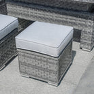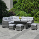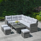 Transform your outdoor living space with the Rimini Corner Sofa Set with Rectangular Rising Table in Grey. Crafted from durable synthetic rattan with an aluminium frame and aluminium feet, this set blends contemporary style with resilience against the elements. The thick flat weave design enhances its modern aesthetic while ensuring long-lasting durability, making it ideal for year-round outdoor use without compromising comfort or elegance. The set includes a spacious corner sofa with plush grey cushions, offering ample seating for gatherings or relaxation under the sun or stars.