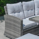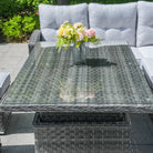 The Rimini Corner Sofa Set easily accommodates diverse gatherings and preferences, featuring a rectangular rising table that effortlessly adjusts from coffee table to dining height. Whether enjoying a casual brunch or hosting an elegant evening cocktail party, this versatile piece seamlessly adapts to your needs. Its sleek grey finish complements any outdoor decor, enhancing the aesthetic appeal and practicality of your patio, garden, or terrace.