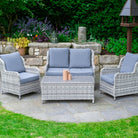 Introducing the Vienna - Deluxe 4 Seater Lounge Set, an elegant enhancement for your indoor or outdoor living area. This set, comprising a 2-seater sofa, 2 lounge chairs, and a generously sized 108 cm x 58 cm rectangular coffee table, exudes sophistication with its wide grey weave, slate grey ceramic glasstop, and deep-filled cushions. The contemporary design and premium materials of the Athens set make it a stylish and comfortable addition to any space, providing an inviting setting for relaxation or socializing.