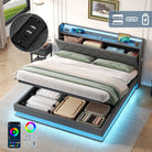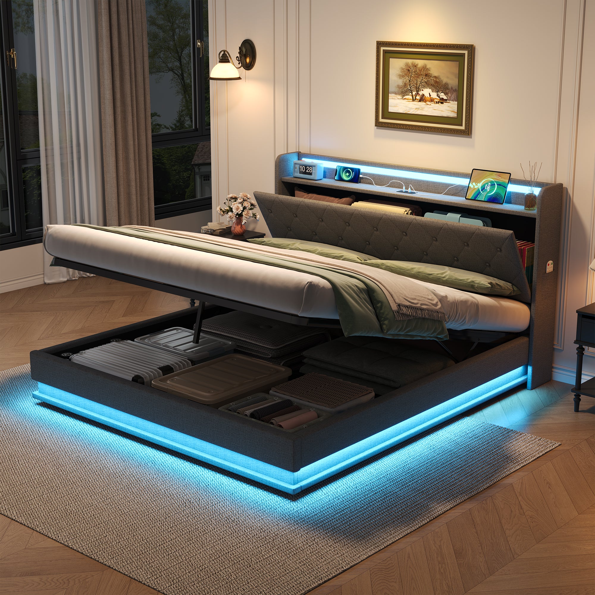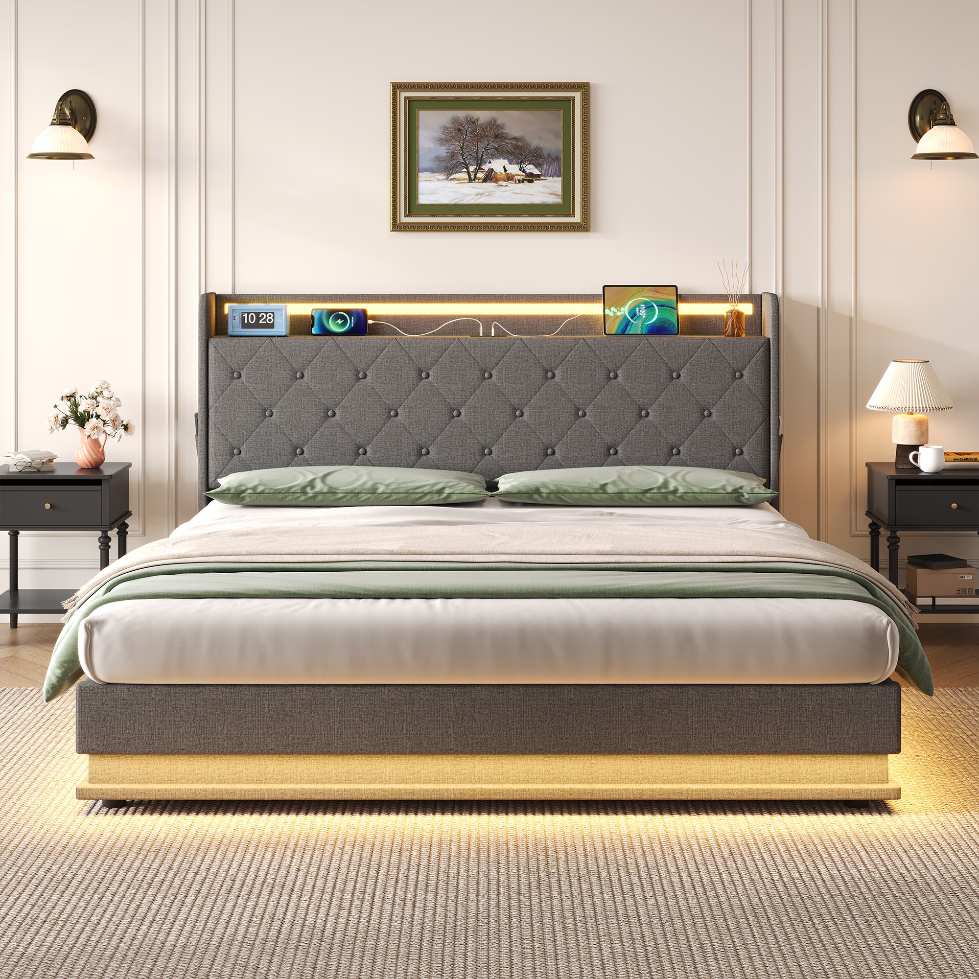 5ft King Upholstered Bed Frame with Hydraulic Storage, LED Button Tufted Headboard, USB and Type-C Ports, Linen, Grey