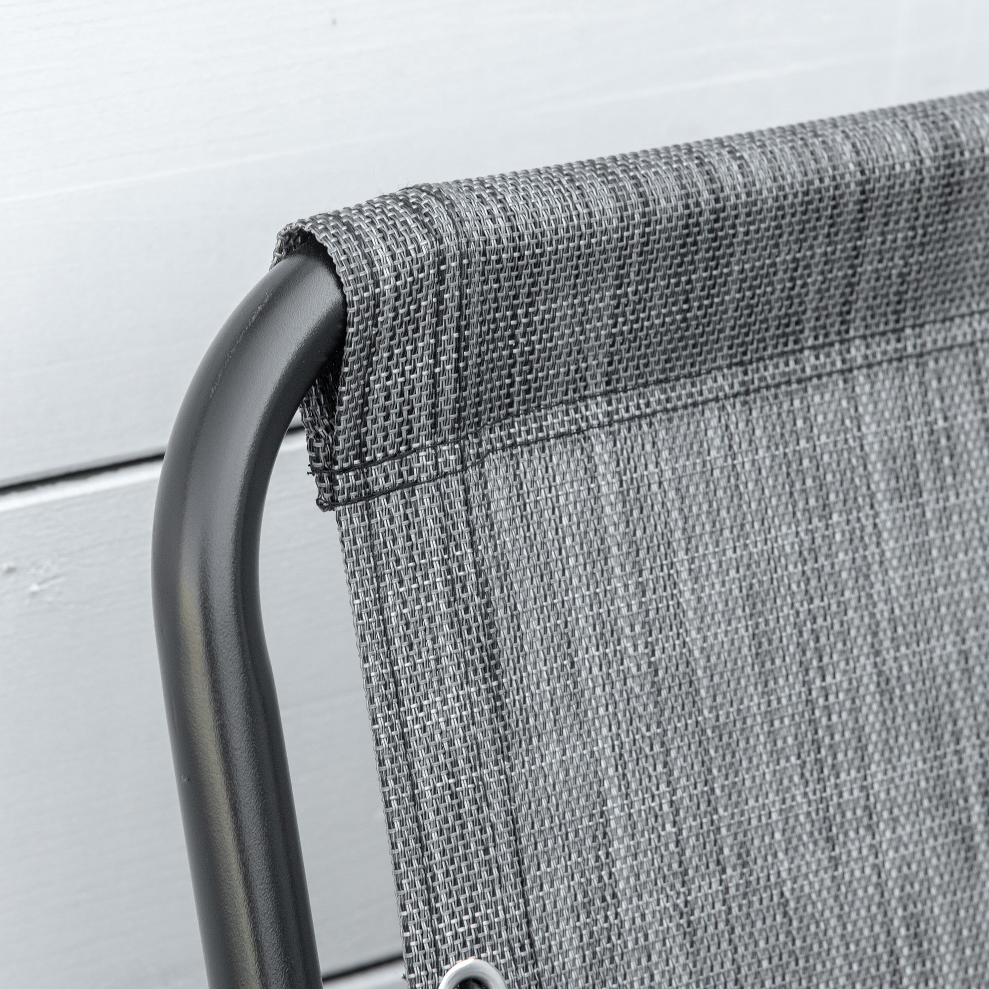 Selected Material: The armrest garden chair set is made of a heavy-duty steel frame with a powder-coated process, bonded with weather-resistant breathable mesh fabric for both sturdiness and comfort.