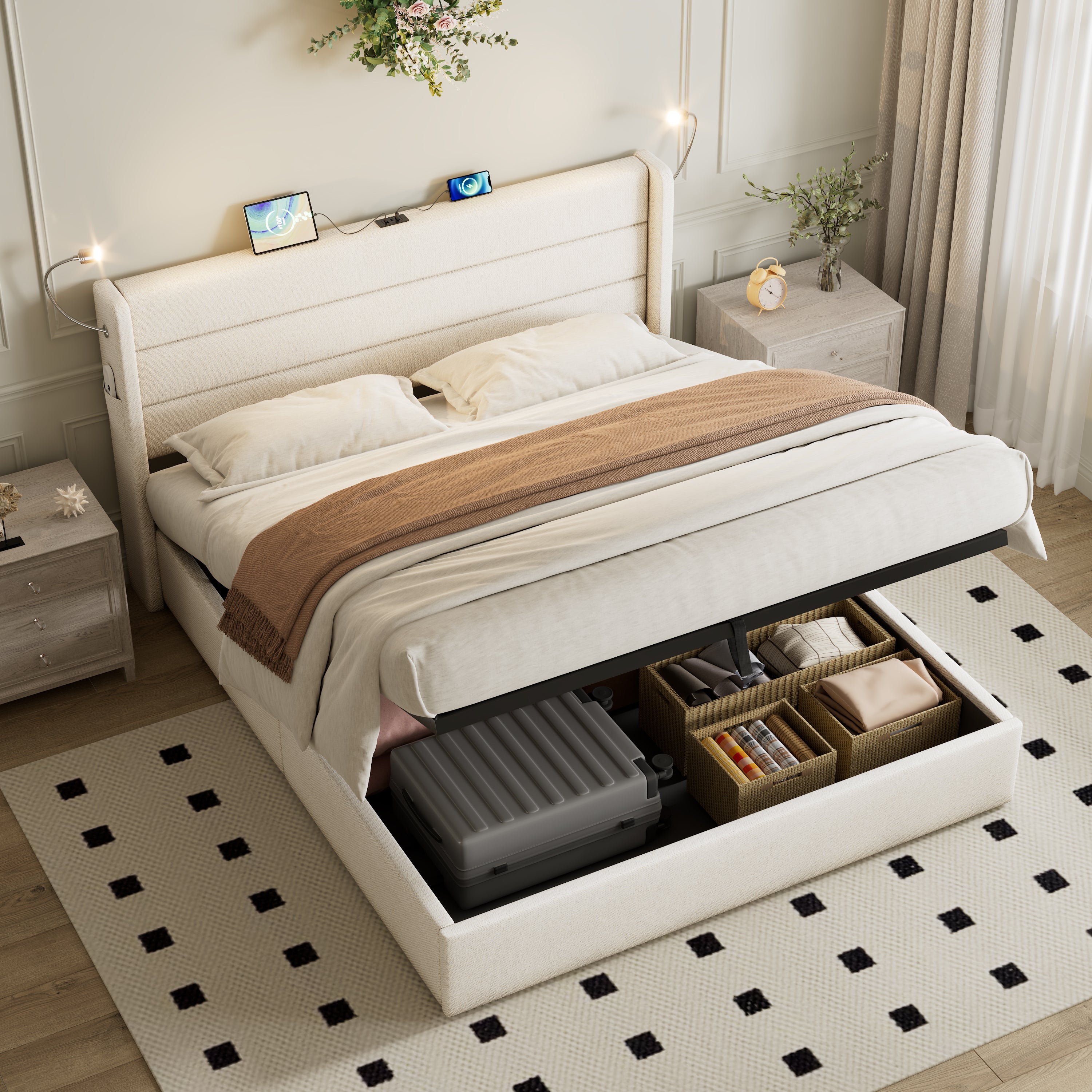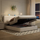 King Upholstered Bed with Charging Station, Hydraulic Storage, Adjustable LED Reading Light, USB and Type-C Ports, Beige Linen