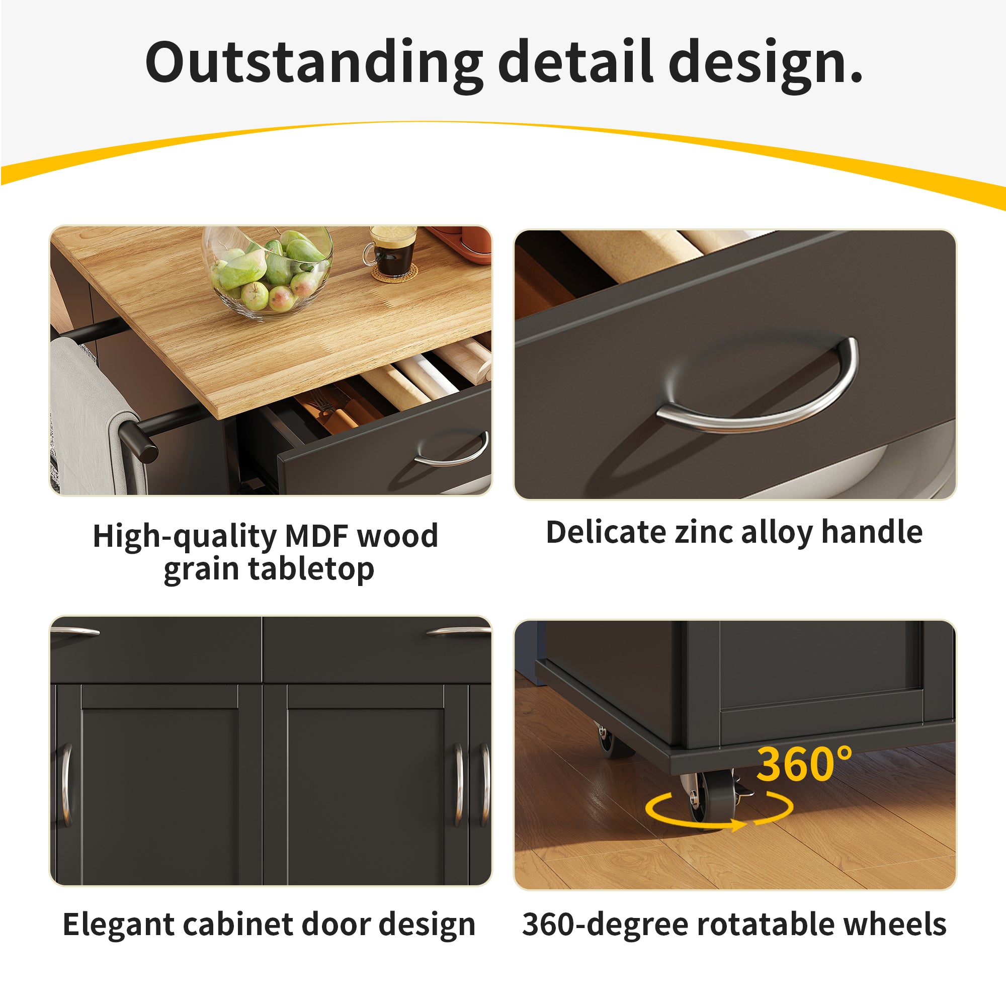 The kitchen island trolley features a simple and modern style that adapts perfectly to various home decoration styles. Its unique and attractive design, with smooth lines and bright colors, showcases unparalleled elegance and adds an artistic atmosphere to your kitchen. The clever modeling design enriches the spatial hierarchy of the kitchen and creates well-defined functional areas, leading to a more reasonable and orderly kitchen layout. Choosing this kitchen island means choosing a high-quality lifestyle, making cooking easier, more enjoyable, and improving your overall life experience.