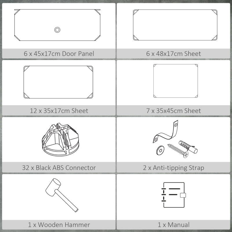 Dimensions: Overall dimensions are 108H x 49W x 36.5D cm. Each single cube is 17H x 45W x 35D cm. Maximum load is 24 kg. Easy to assemble.