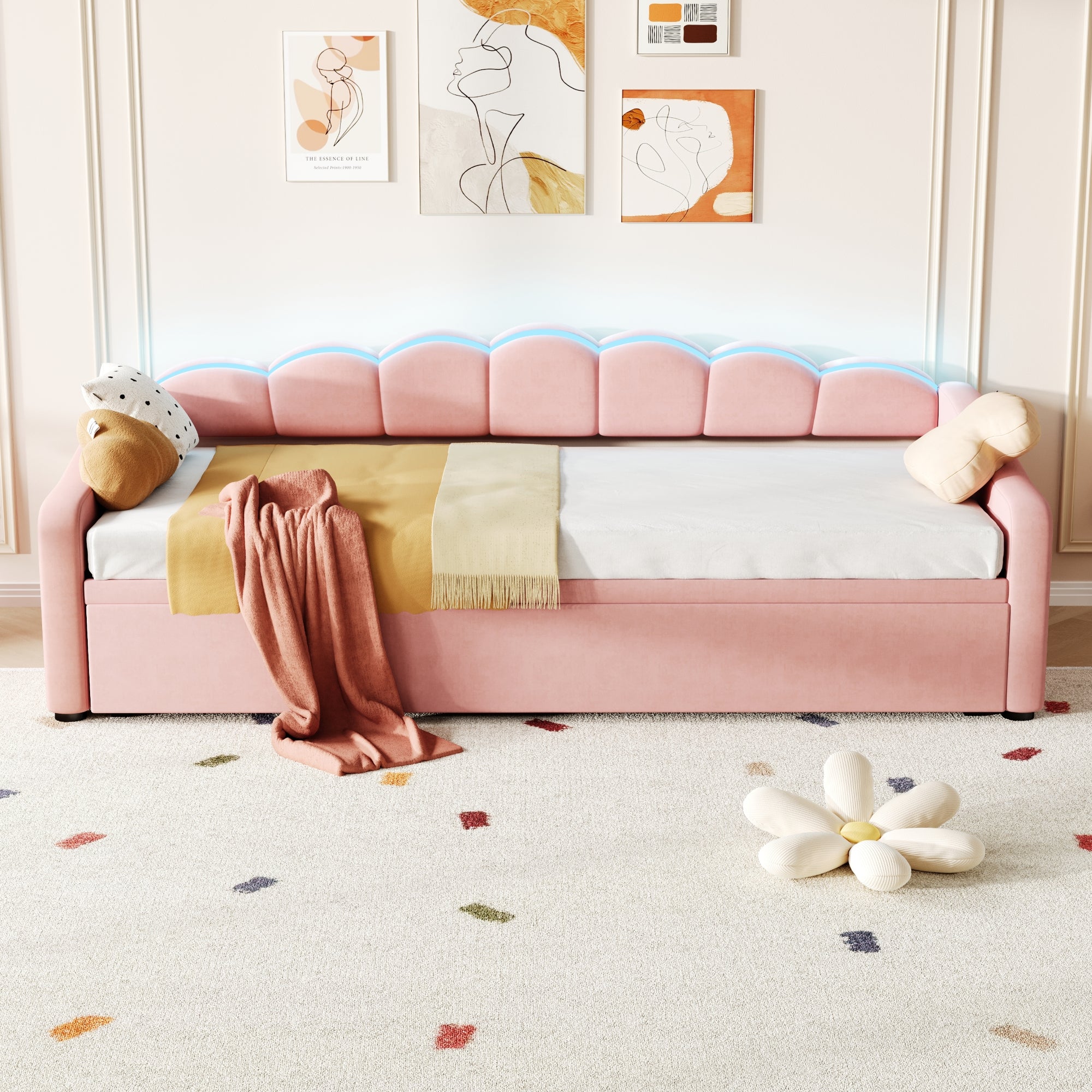 Long Description: This versatile daybed easily converts from a comfortable sofa to a spacious daybed with straps and bottom wheels, perfect for both relaxation and entertaining. Featuring an integrated RGB LED strip, this sofa bed adds a chic and subtle beauty to your home. Padded with high resilience sponge and covered in soft velvet, it provides excellent support for reading and unwinding. Its unique petal shape design allows it to blend seamlessly into various living scenarios, making it a stylish highlight in any home. Whether you're enjoying your favorite shows or hosting guests, this space-saving couch offers the ideal balance of functionality and comfort.